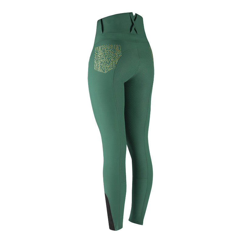 Pantalon d'équitation élégant en tissu Aqua X fonctionnel. L'Élégance présente une taille haute avec 3 boutons à l'avant et une découpe en V à l'arrière. Ce pantalon d'équitation est doté de poches suffisamment profondes pour ranger un téléphone portable. Caractéristiques du produit : Déperlant, régulant l'humidité et respirant : taille haute avec découpe en V à l'arrière, 3 boutons pour passants de ceinture et deux fausses poches arrière, pois argentés et dorés sur les poches avant et arrière, fond intégral en silicone grain de riz. Composition : 38 % nylon, 50 % Aqua X, 12 % élasthanne.