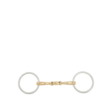 Ce mors de filet de haute qualité à double brisure est fabriqué en Cuprigan massif avec des anneaux en acier inoxydable. Le Cuprigan est un alliage composé de 89% de cuivre, 7% d'aluminium, 3% de fer et 1% de zinc. Le processus d'oxydation du matériau dégage une odeur et un goût agréables. La forme anatomique suit la forme de la bouche du cheval, ce qui crée une répartition de la pression douce et uniforme. La combinaison de la forme et de la composition unique du Cuprigan stimule la mastication et la salivation, ce qui permet une connexion agréable avec la bouche sensible du cheval. Le mors a une action douce sur la bouche. L'embout a une épaisseur de 16 mm et les anneaux du mors ont un diamètre de 70 mm. ??