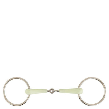 Ce mors simple brisure est doté d'une embouchure en plastique avec une âme métallique et des anneaux en acier inoxydable. Grâce à l'association de plastique souple et d'acier inoxydable de haute qualité, ce mors est stable tout en étant exceptionnellement souple et délicat. Le plastique a une dureté de 90A et est approuvé par la FDA. Cela signifie que le matériau est sans solvant, sans plastifiant et non toxique. Sa forme anatomique épouse la forme de la bouche du cheval, assurant une répartition douce et uniforme de la pression.