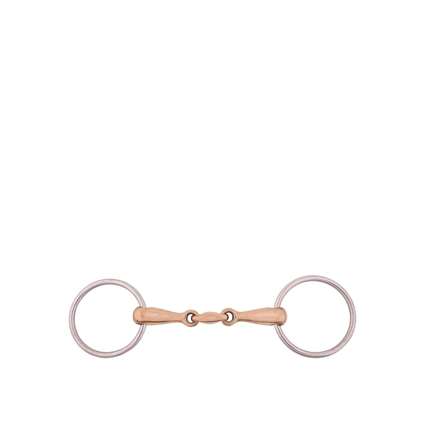 Doppelt gebrochen, massives Cuprion mit Edelstahlringen, Ringe 65 mm. Das Mundstück hat eine Dicke von 18 mm.