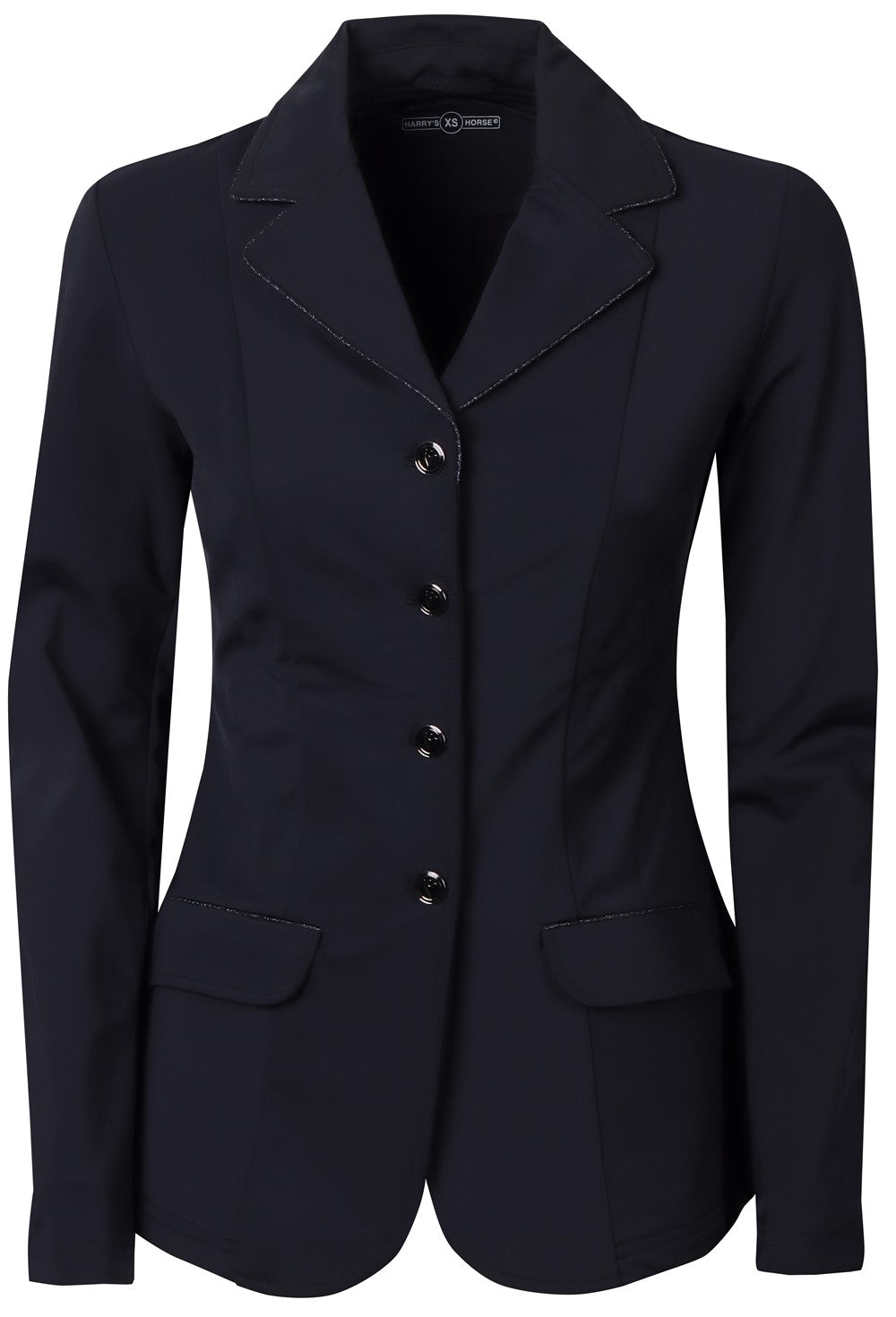 Turnierjacke aus Stretchmaterial und einer schönen Glitzerpaspelierung entlang des vorderen Verschlusses, der Taschen und der Blende auf der Rückseite, ausgestattet mit zwei Eingrifftaschen und einem Knopfverschluss mit Reißverschluss dahinter.
