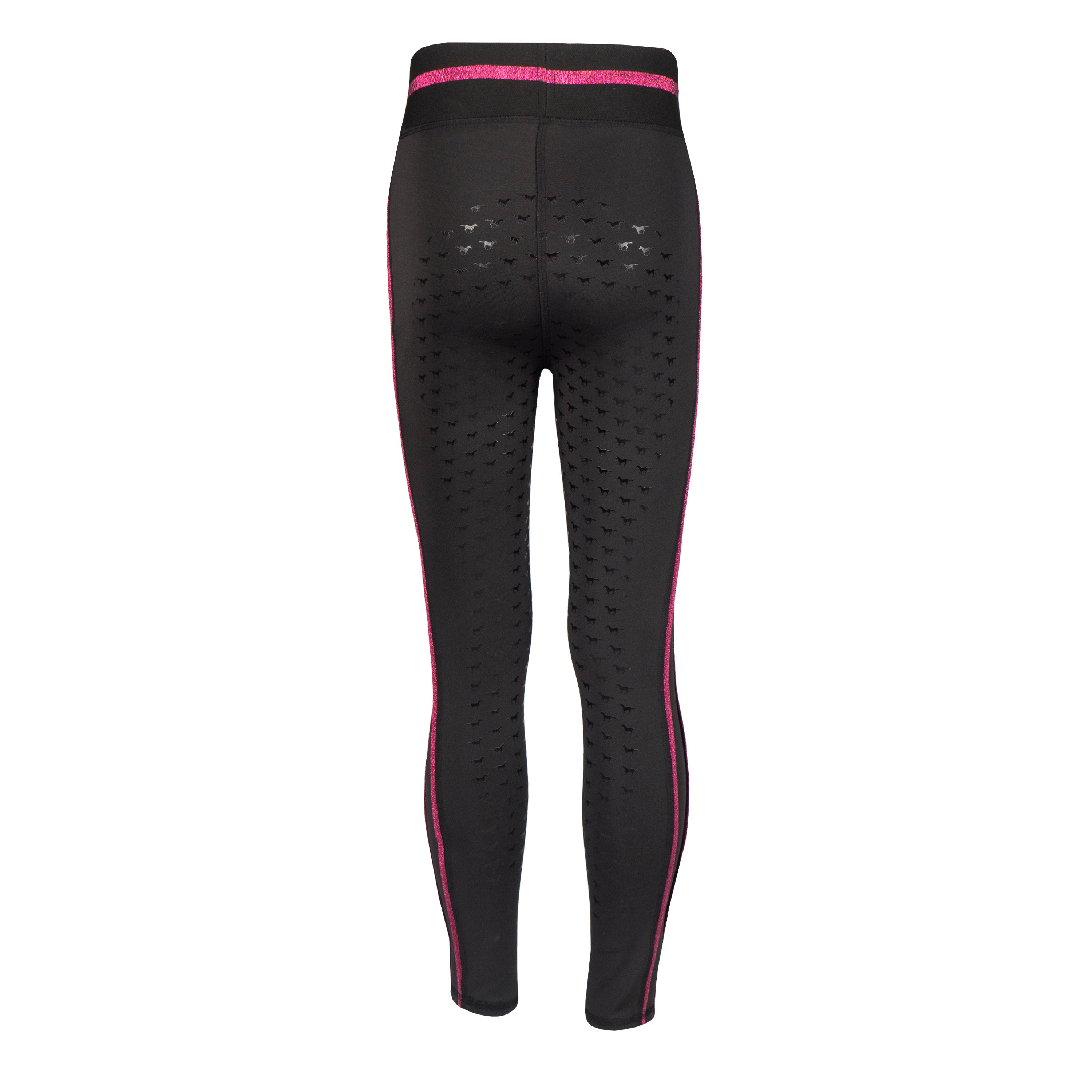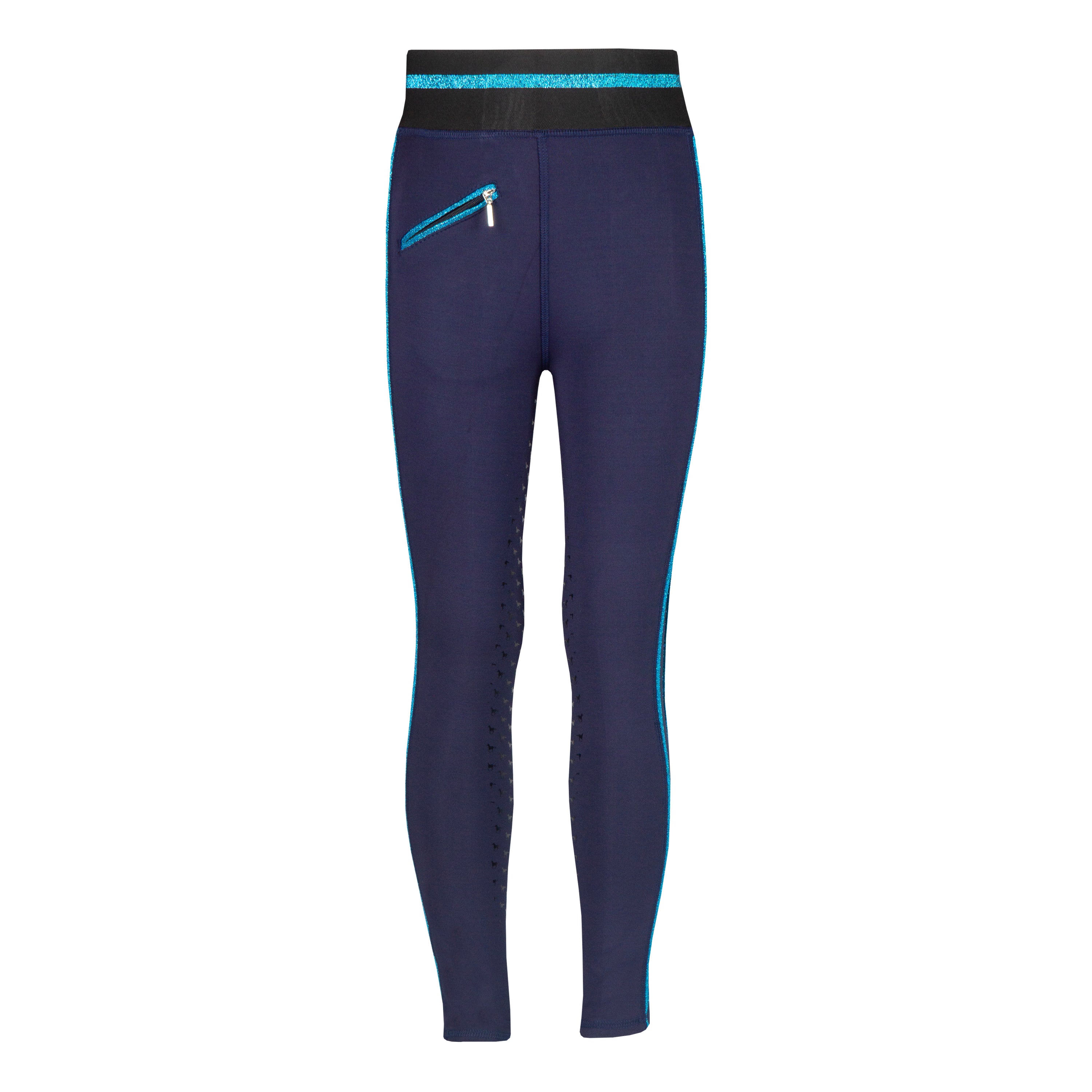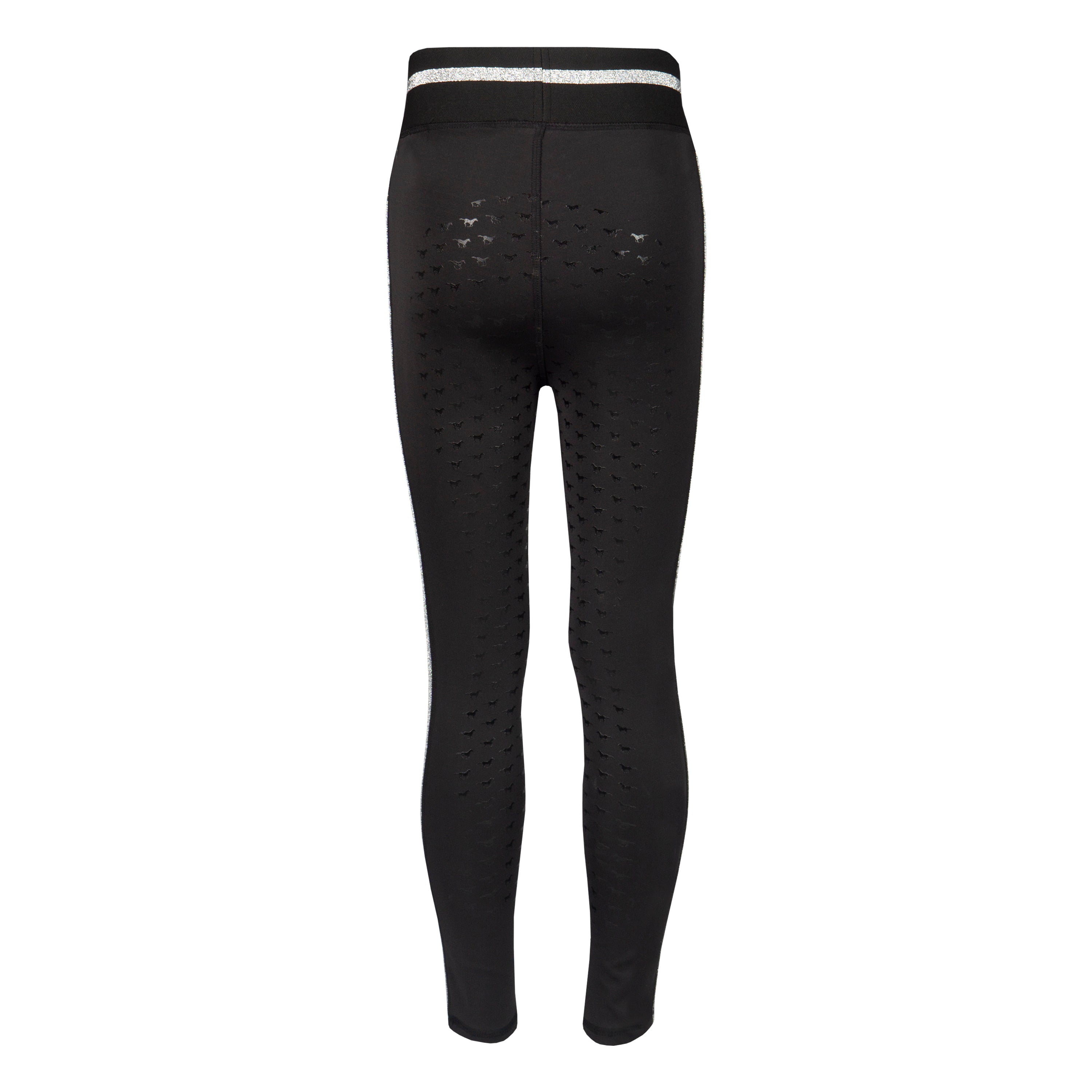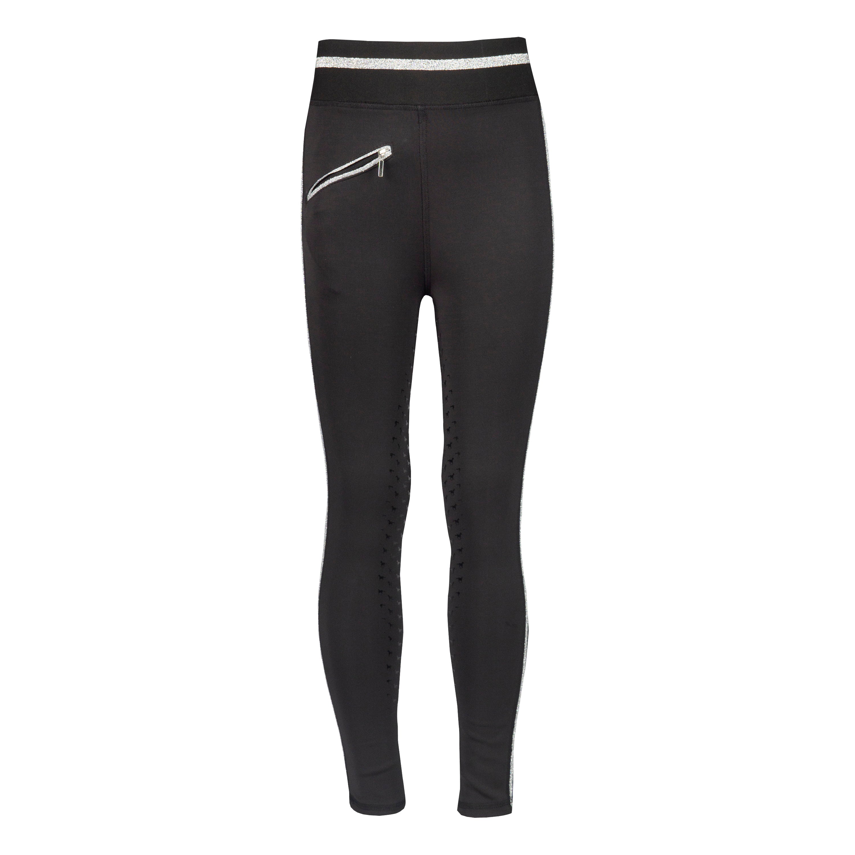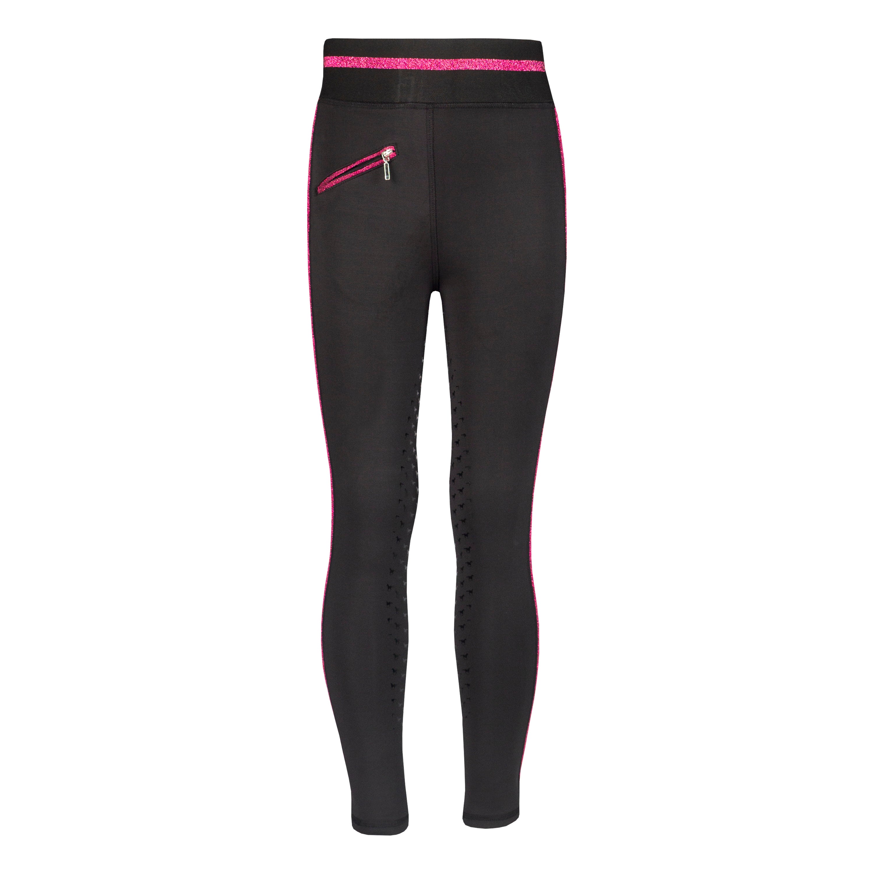 Basic Kinder-Reitleggings mit lustigen Glitzerdetails und durchgehendem Silikonbesatz. Die Reitleggings sind dank des elastischen Bunds bequem und verfügen über eine Reißverschlusstasche vorne. Produktspezifikationen: Elastischer Bund mit Lurex-Glitzerstreifen Lurex-Glitzerpaspelierung an beiden Beinen Artwork im Glitzerdruck in Kontrastfarbe Kontrastierende Reißverschlusstasche vorne Vollständiger Silikonbesatz Material: 88 % Polyester, 12 % Elastan