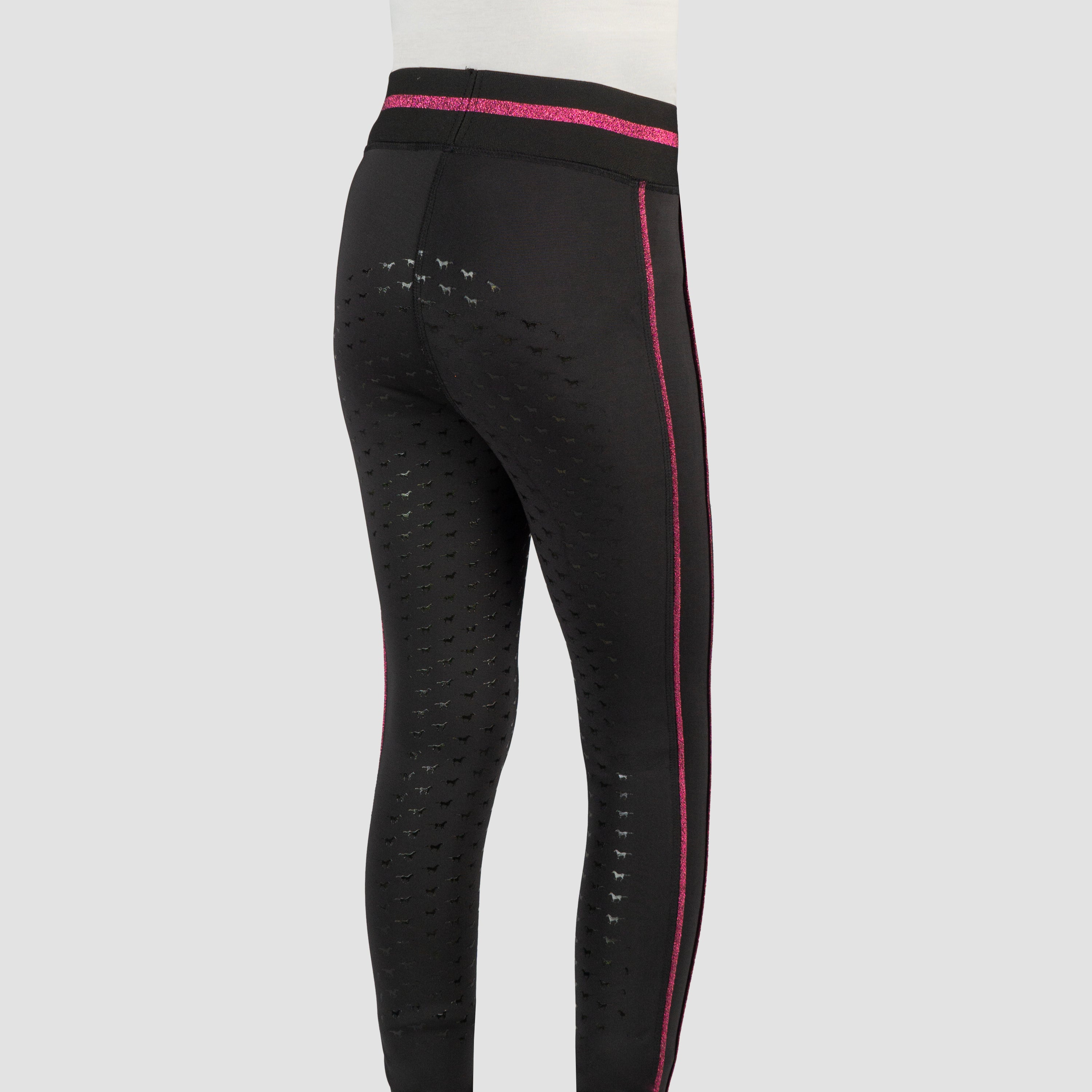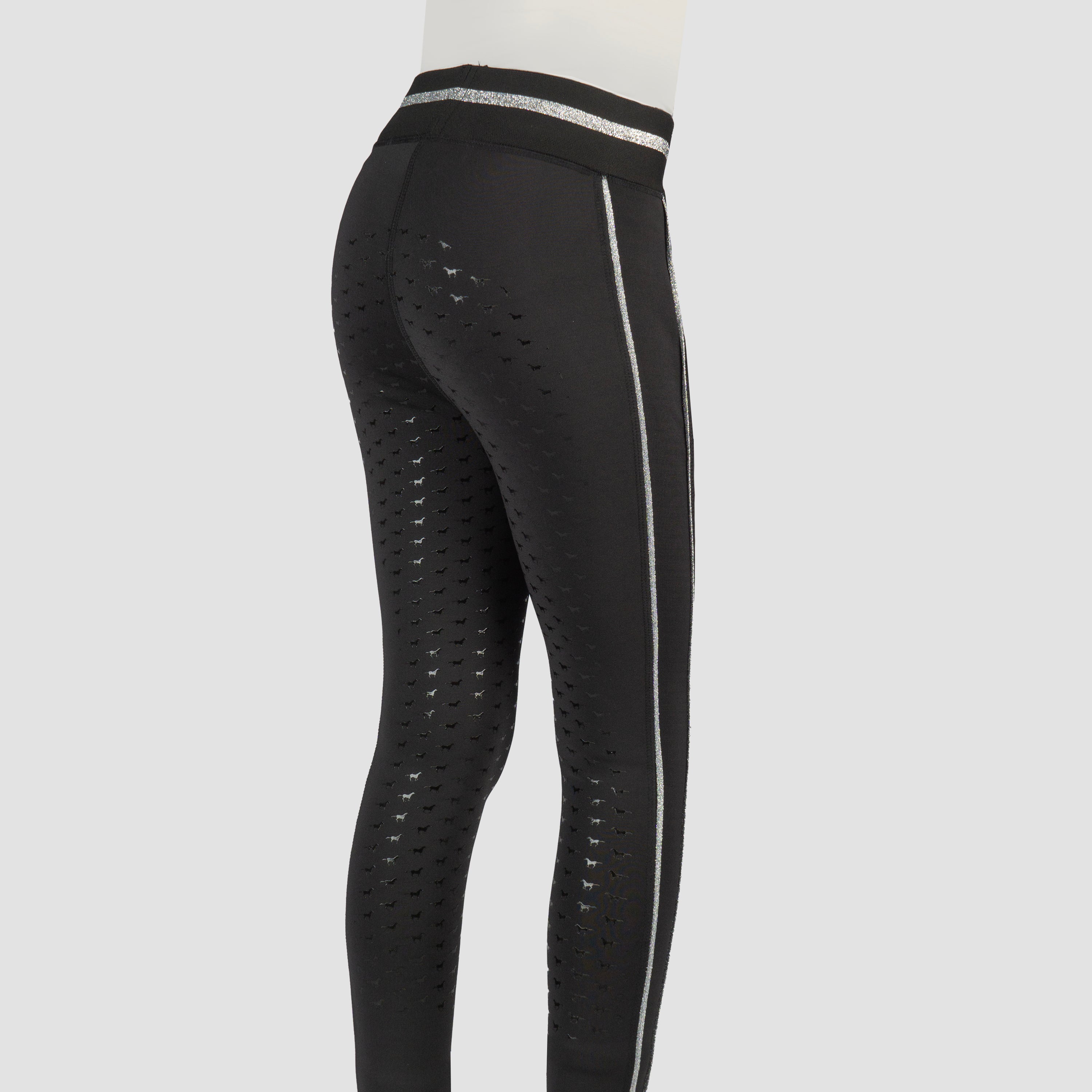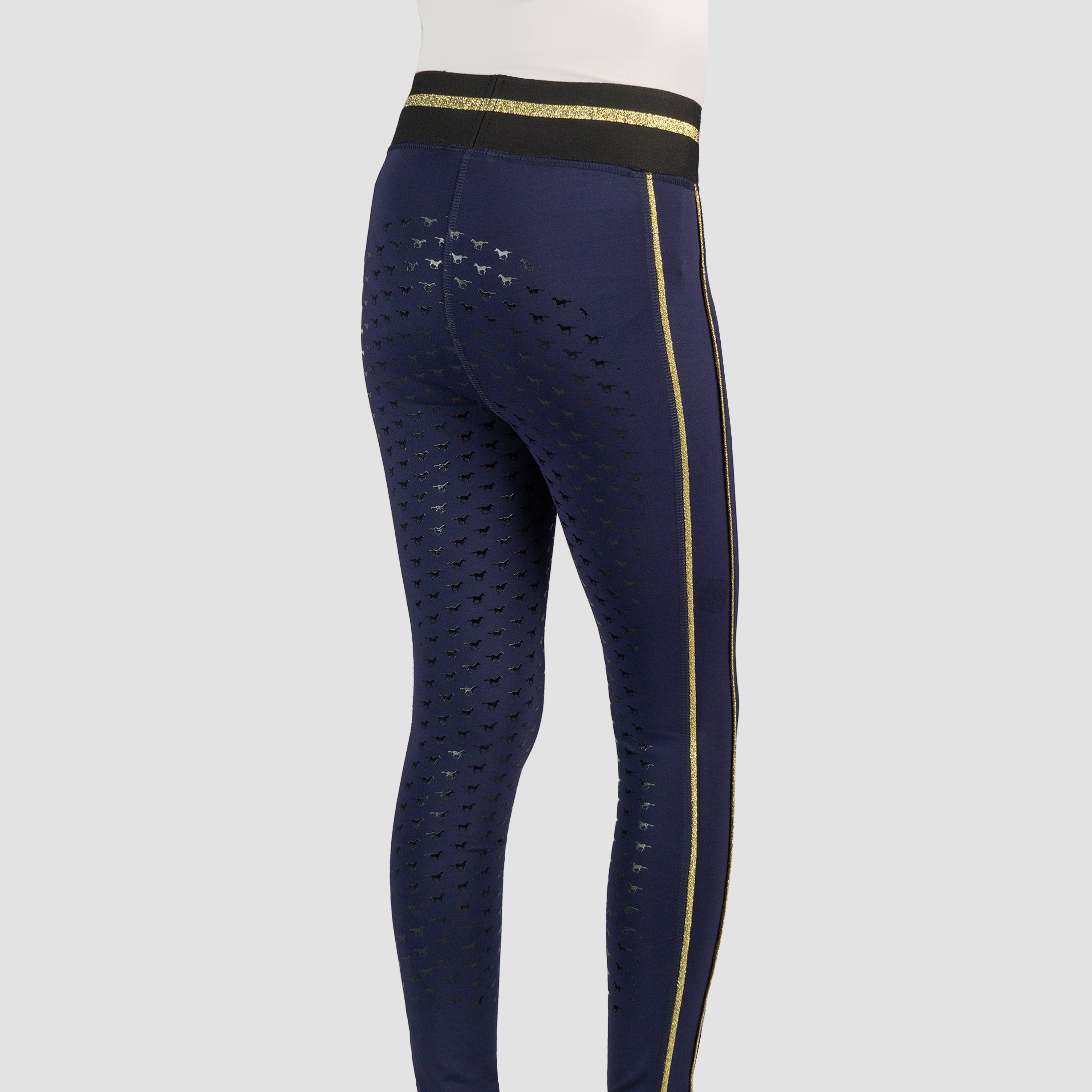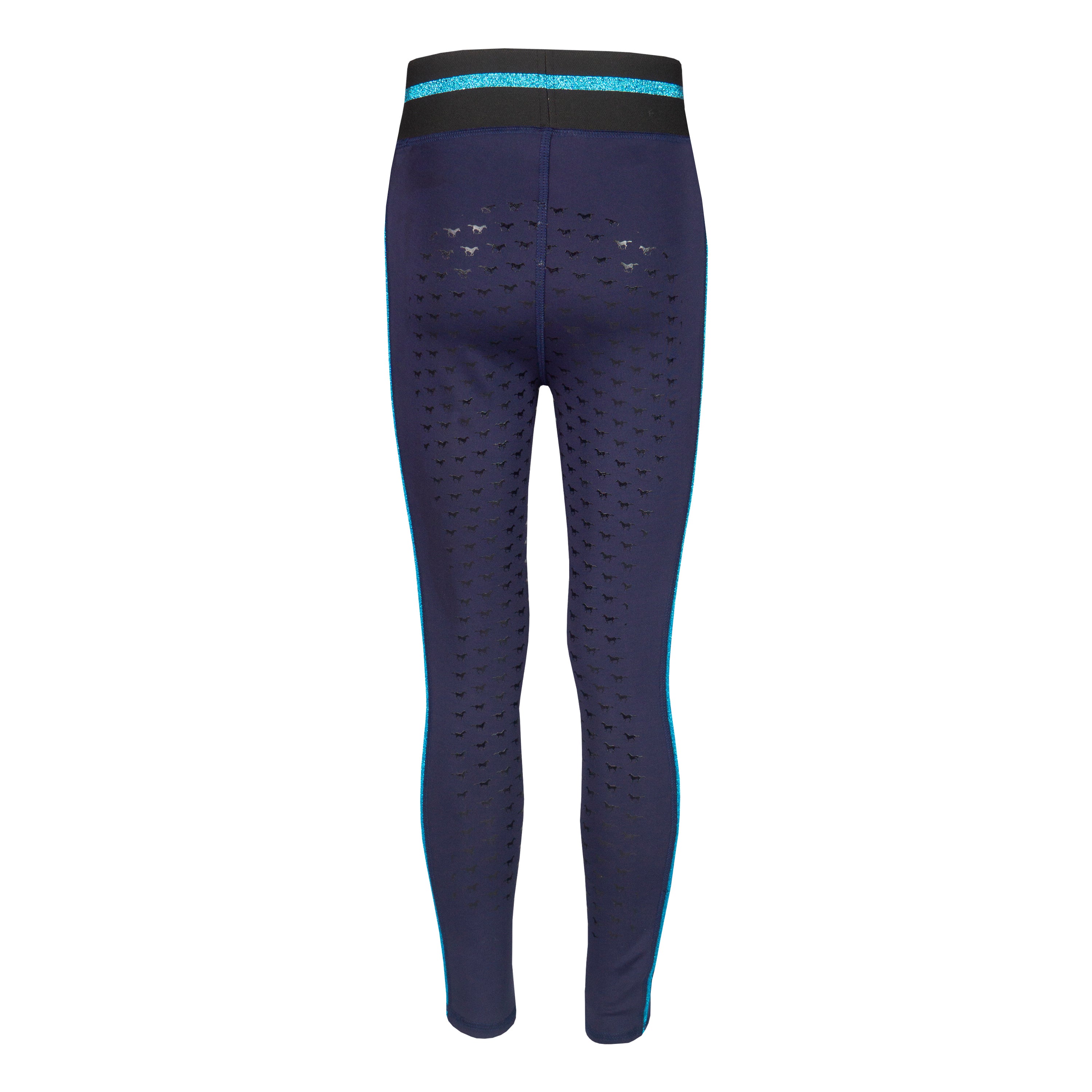 Basic Kinder-Reitleggings mit lustigen Glitzerdetails und durchgehendem Silikonbesatz. Die Reitleggings sind dank des elastischen Bunds bequem und verfügen über eine Reißverschlusstasche vorne. Produktspezifikationen: Elastischer Bund mit Lurex-Glitzerstreifen Lurex-Glitzerpaspelierung an beiden Beinen Artwork im Glitzerdruck in Kontrastfarbe Kontrastierende Reißverschlusstasche vorne Vollständiger Silikonbesatz Material: 88 % Polyester, 12 % Elastan