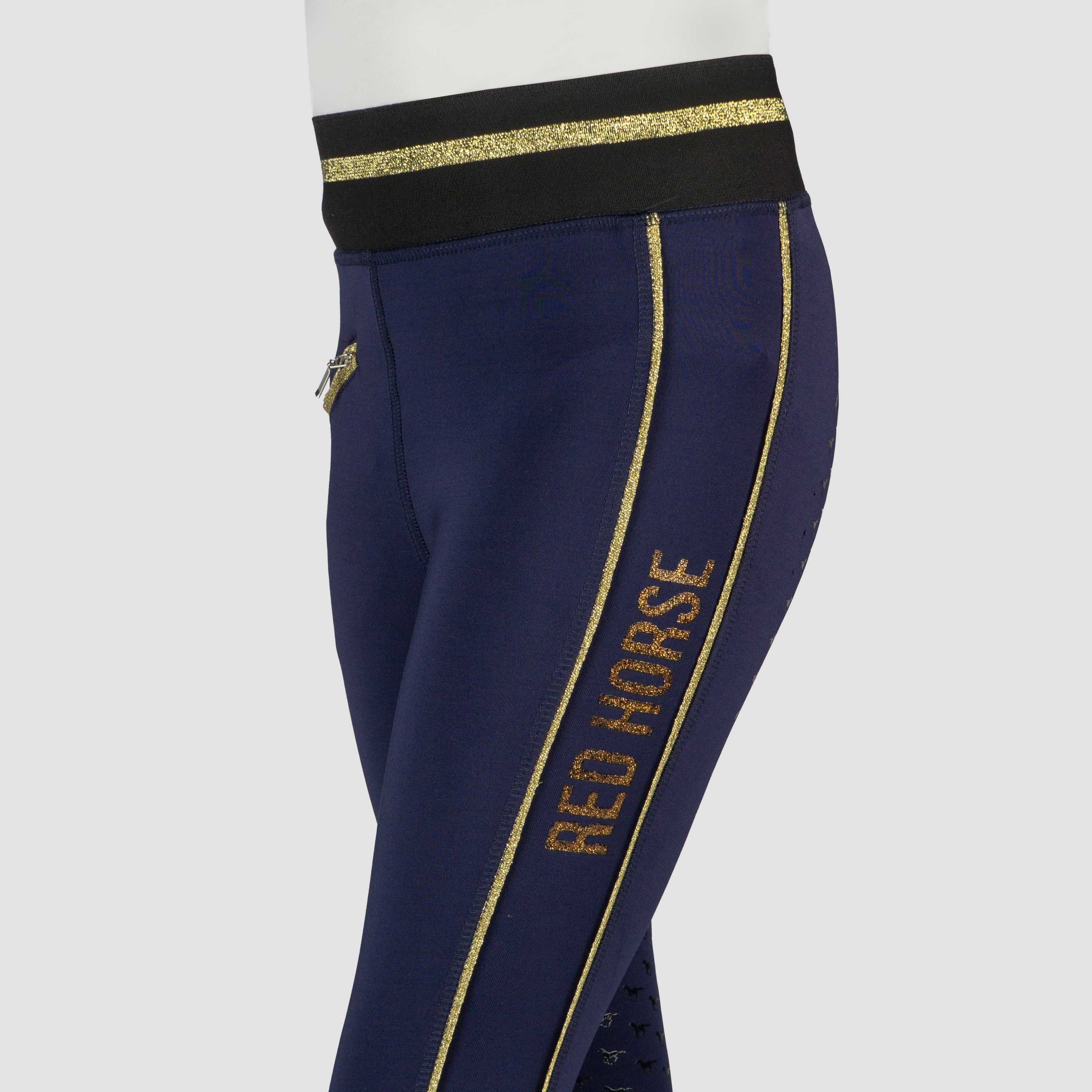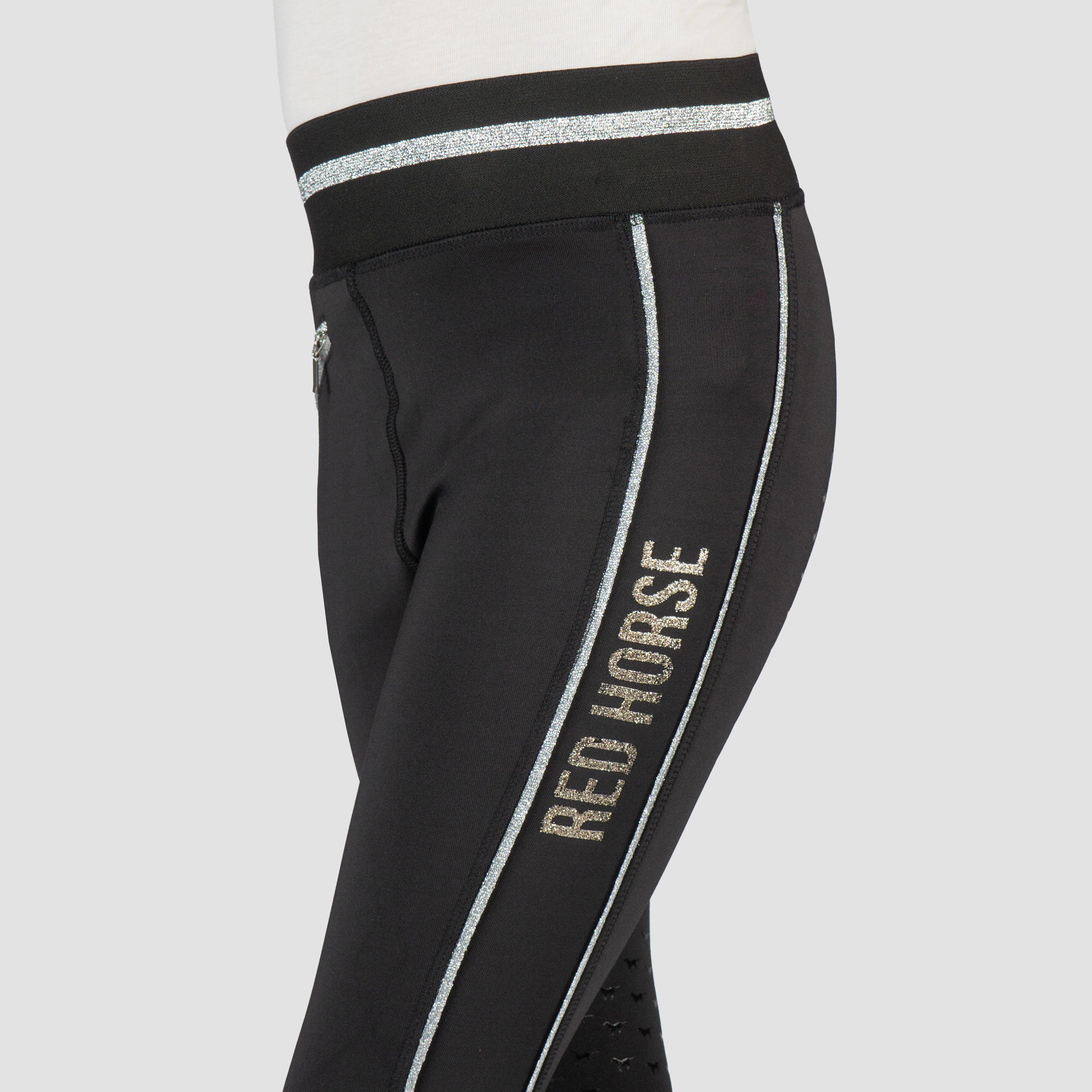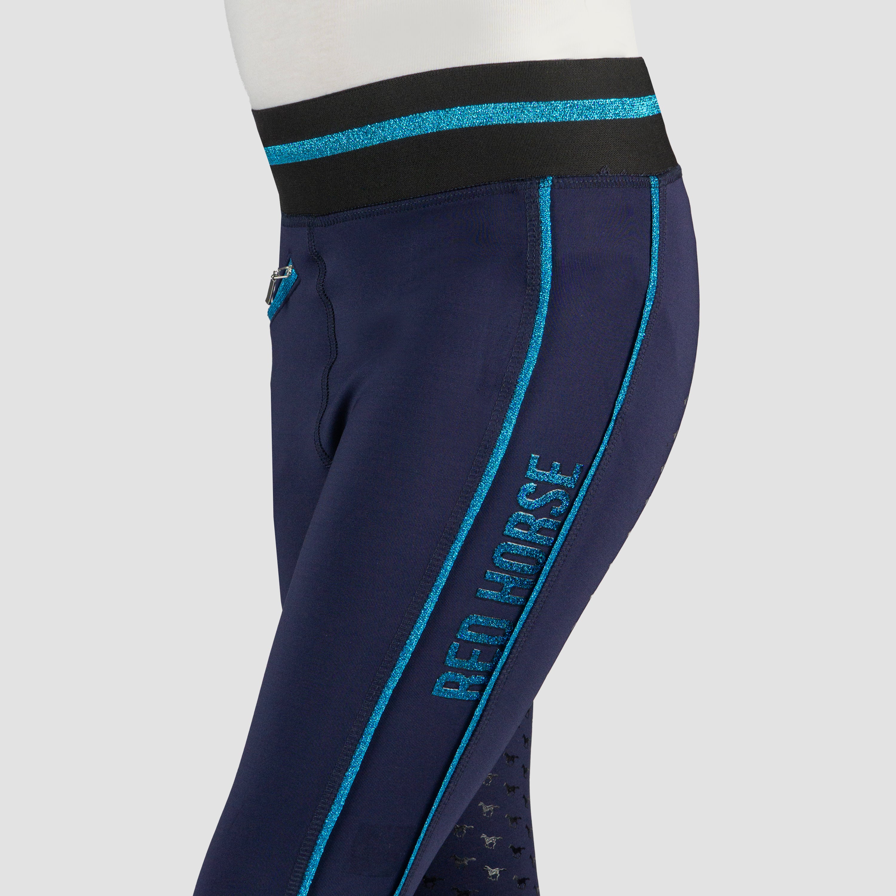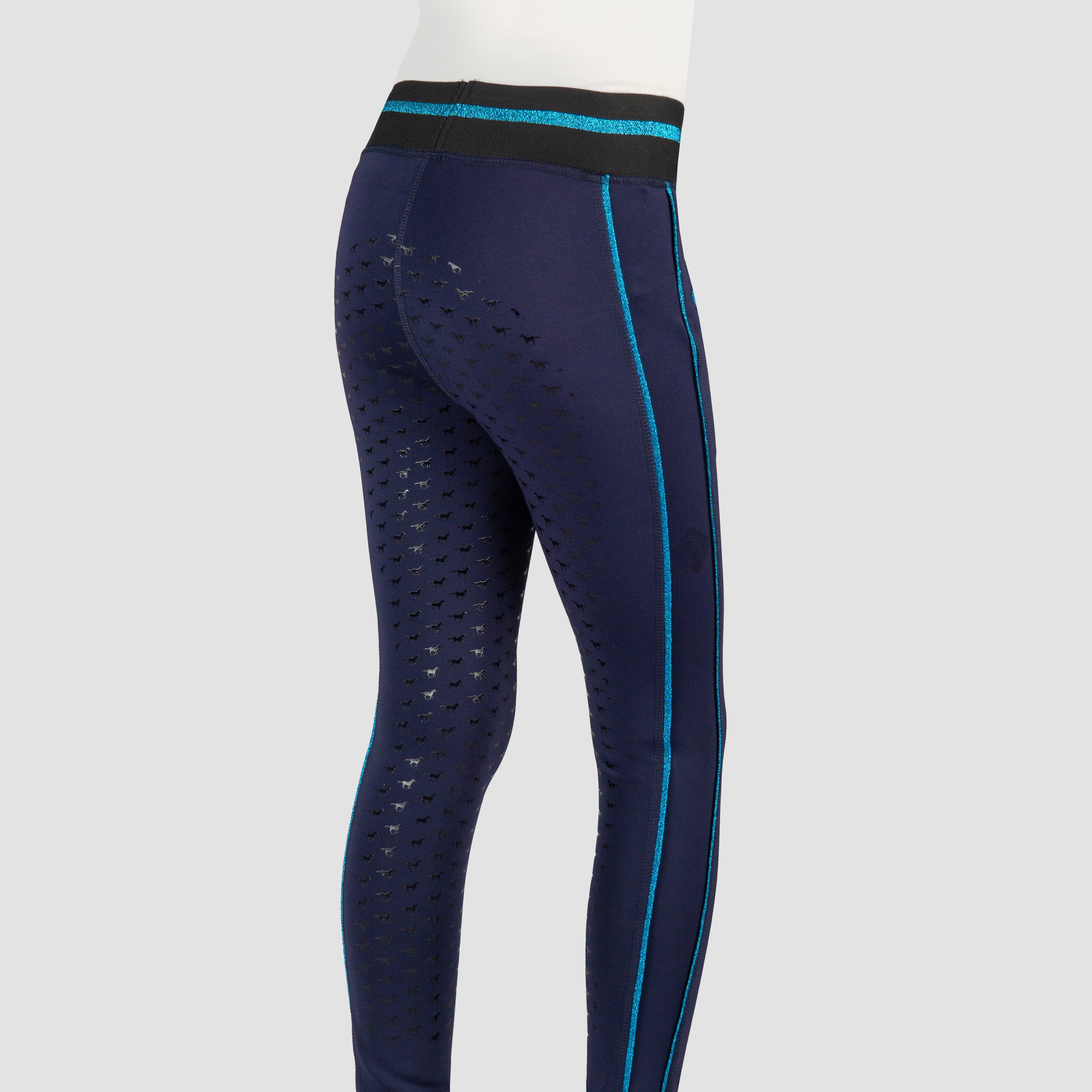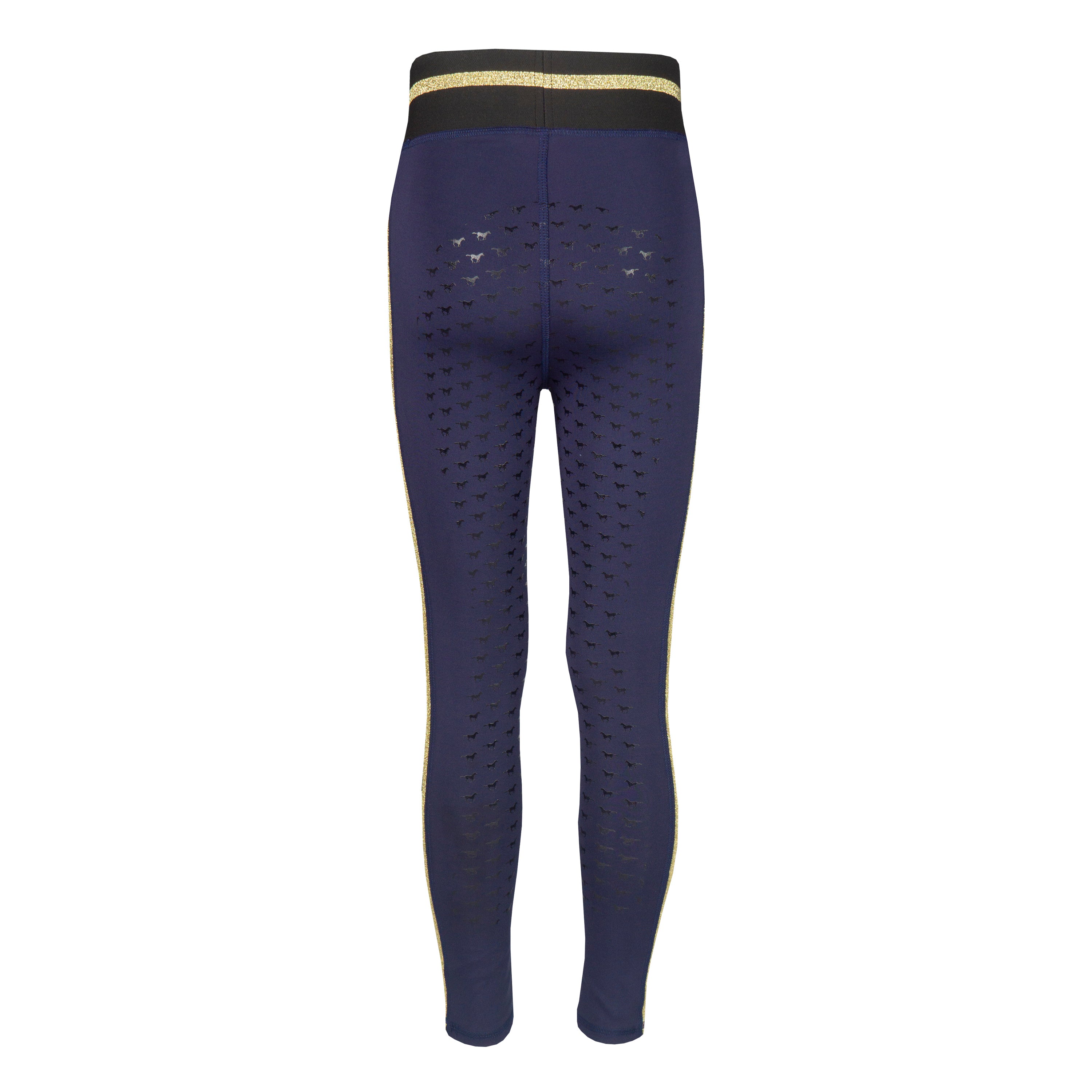 Basic Kinder-Reitleggings mit lustigen Glitzerdetails und durchgehendem Silikonbesatz. Die Reitleggings sind dank des elastischen Bunds bequem und verfügen über eine Reißverschlusstasche vorne. Produktspezifikationen: Elastischer Bund mit Lurex-Glitzerstreifen Lurex-Glitzerpaspelierung an beiden Beinen Artwork im Glitzerdruck in Kontrastfarbe Kontrastierende Reißverschlusstasche vorne Vollständiger Silikonbesatz Material: 88 % Polyester, 12 % Elastan