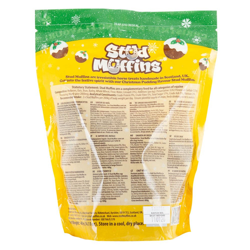 Speziell für die Feiertage präsentiert Stud Muffins eine ganz besondere Geschmacksrichtung: Weihnachtspudding! Die festliche Verpackung enthält ca. 15 gesunde und leckere Pferdekekse, 100 % handgefertigt. Hergestellt aus Getreide wie Weizen, Hafer, Gerste und Mais, angereichert mit Leinsamen und Bockshornklee. Dieser Leckerbissen eignet sich perfekt als Snack oder Belohnung für Ihr Pferd oder Pony. Limitierte Auflage, solange der Vorrat reicht.