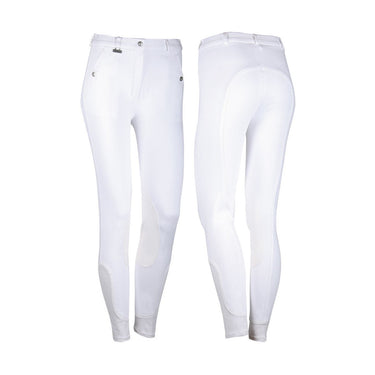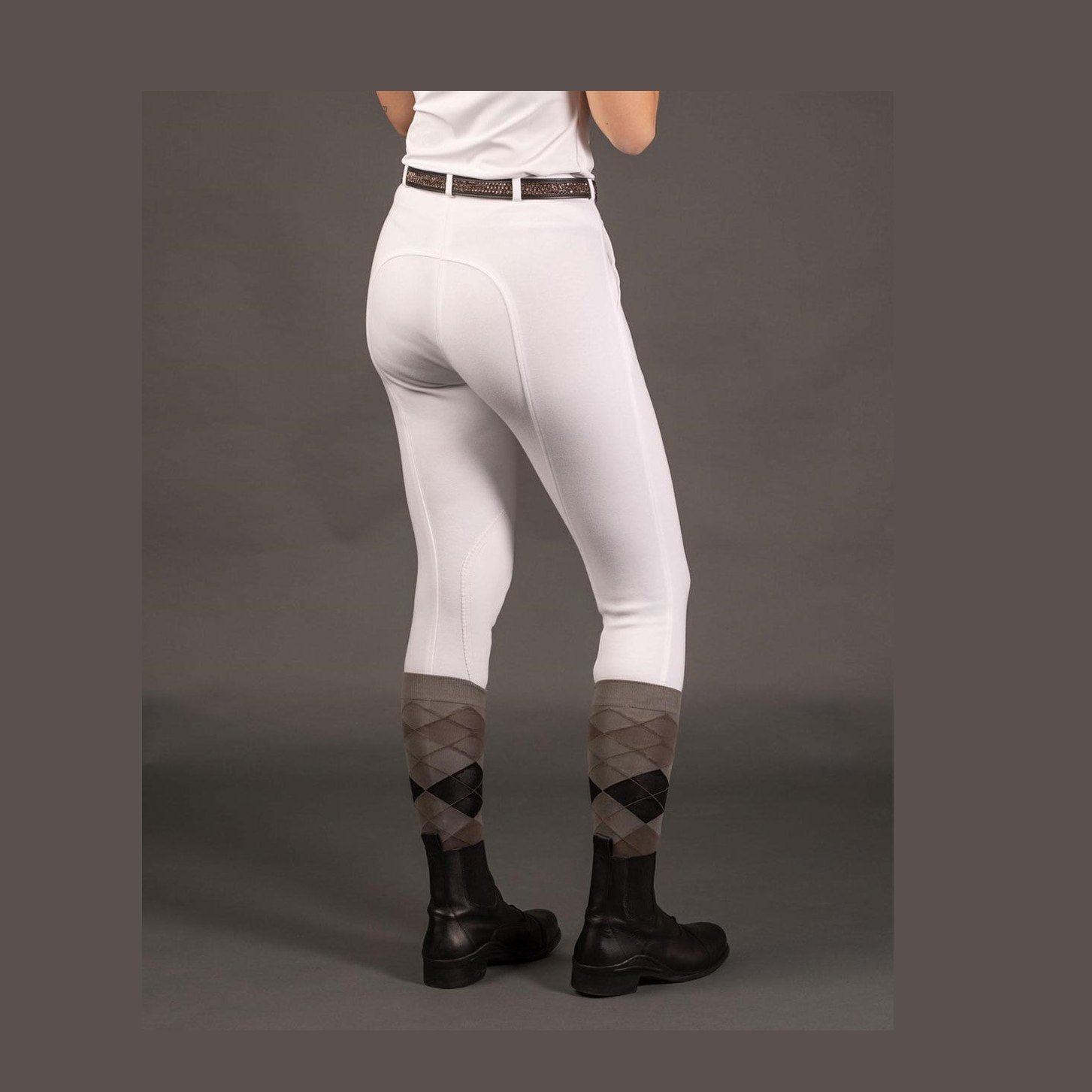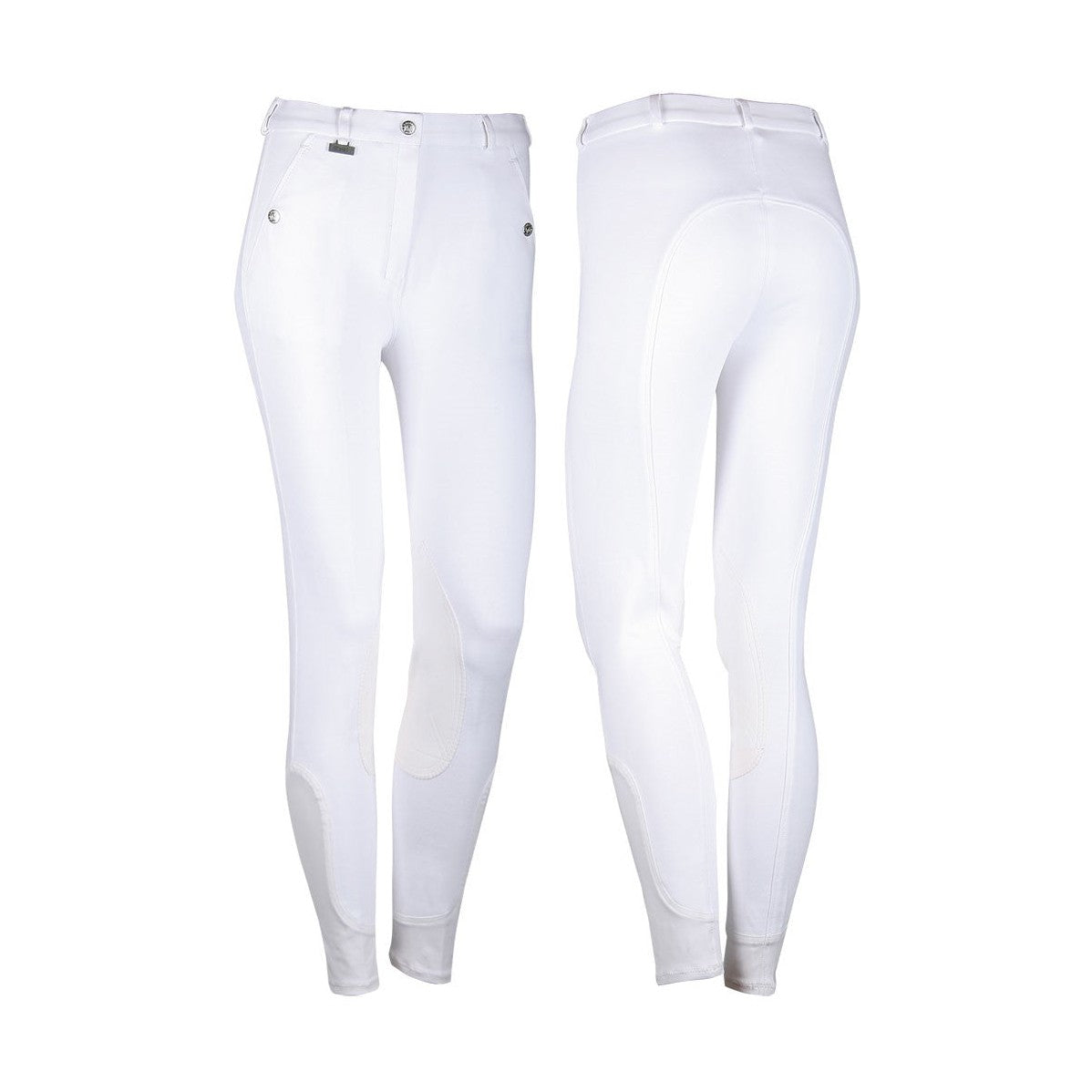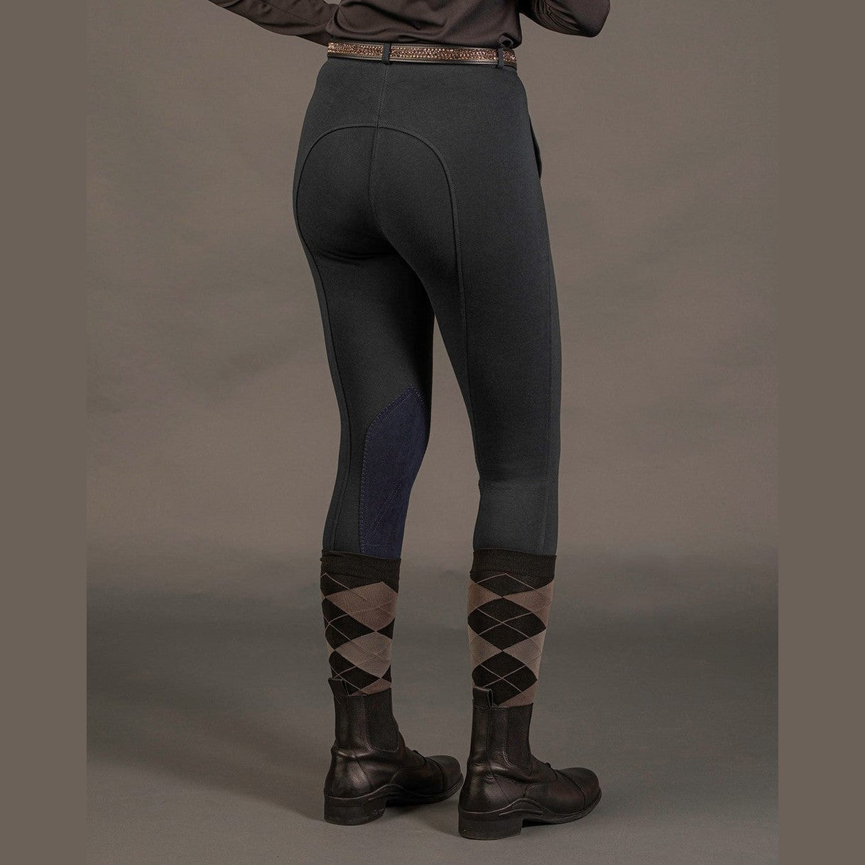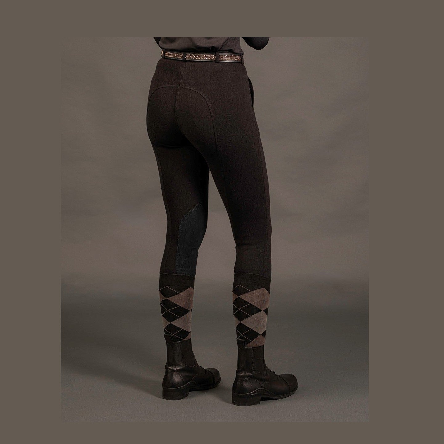 Culotte d'équitation avec poches latérales avec fermeture à bouton-pression, fermeture à boucle coulissante et fermeture éclair, passants de ceinture, genouillères élastiquées en simili cuir et insert élastiqué au bas des jambes.