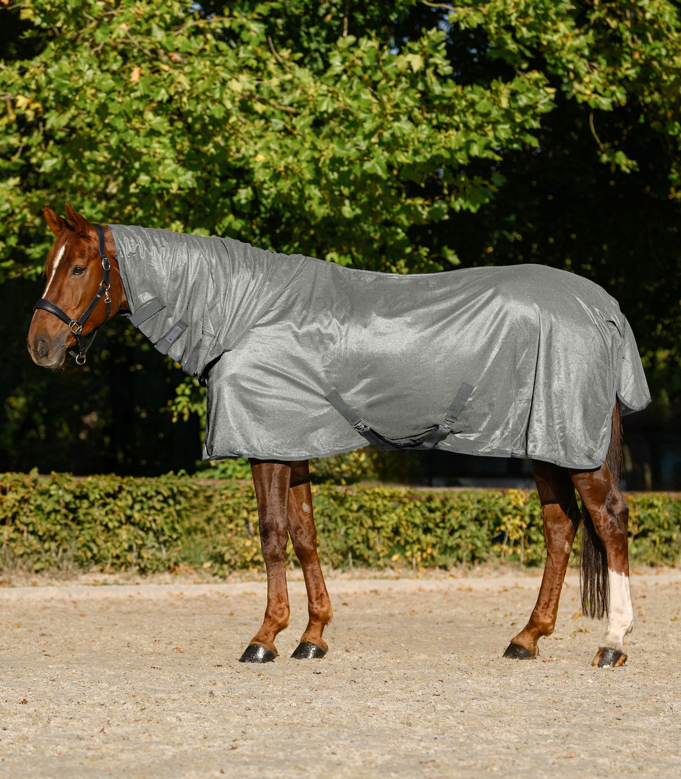 Cette couverture anti-mouches FlyControl de haute qualité, avec protection du cou, allie légèreté, respirabilité et protection optimale pour votre cheval. Son tissu brillant assure un confort optimal au pré et au paddock et prévient la surchauffe en réfléchissant la lumière du soleil. De plus, elle offre une protection UV fiable, garantissant la sécurité de votre cheval même par temps ensoleillé. La protection du cou amovible, les sangles de cuisses, les sangles croisées pratiques et le large rabat de queue assurent un maintien parfait et une liberté de mouvement maximale. Le rembourrage doux au niveau du poitrail et la fermeture en T à l'avant facilitent la mise en place et le retrait.