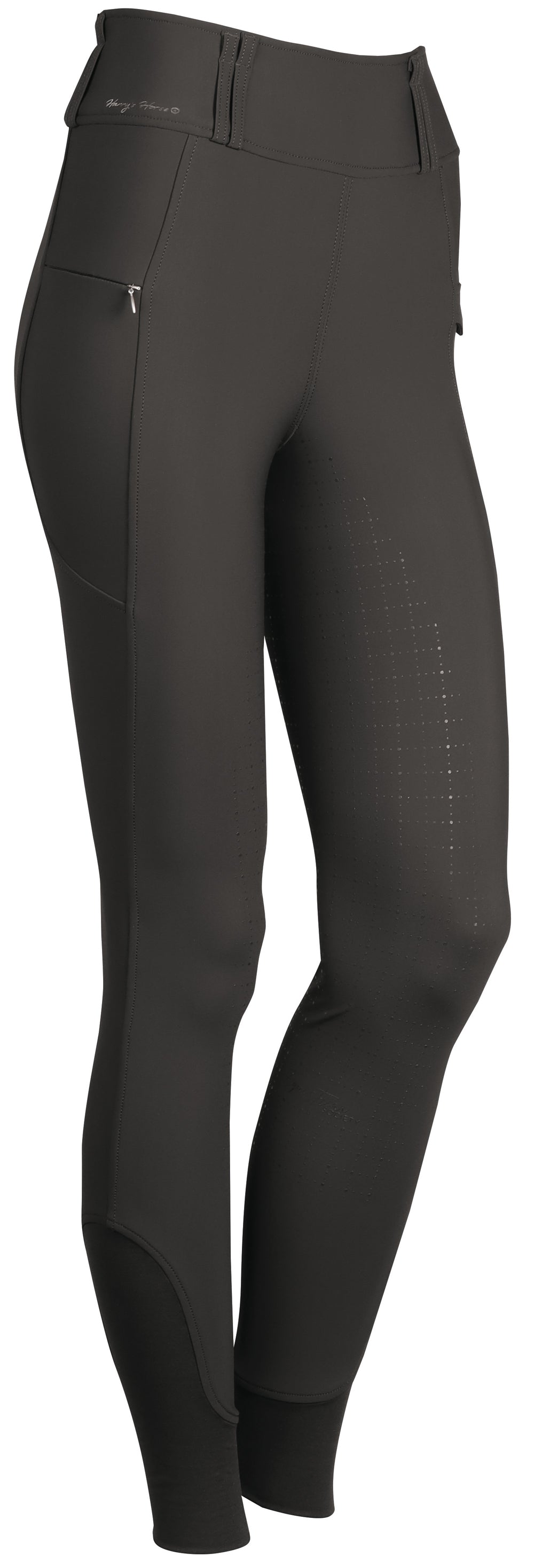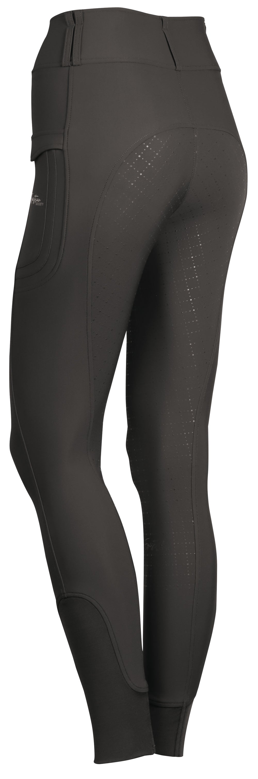 Paardrijlegging met een hoge tailleband met riemlussen, twee zakken waarvan een met een ritssluiting en de ander met een flapje, Equestrian Society logo op de linkerzak, zitvlak met een siliconen print voor extra grip in het zadel en een elastische inzet bij de enkels voor meer comfort in je paardrijlaarzen.