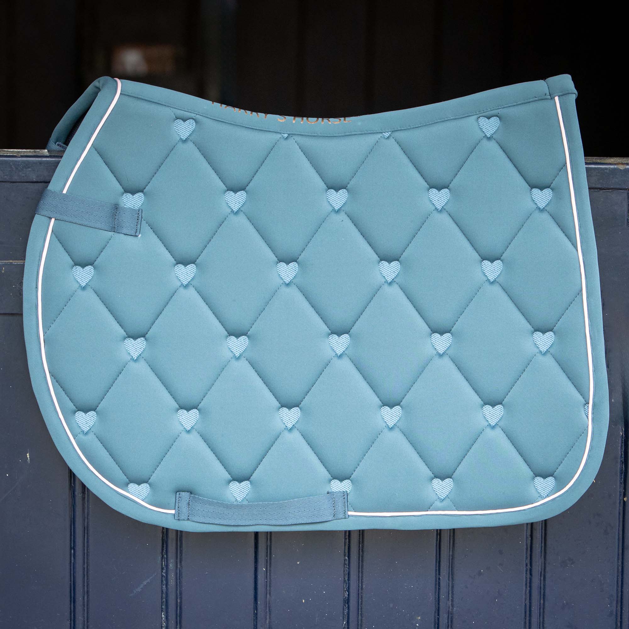 Tapis de selle entièrement matelassé en forme de cœur avec passepoil rose tout autour, doublure en maille respirante, passants pour la sangle et la selle.