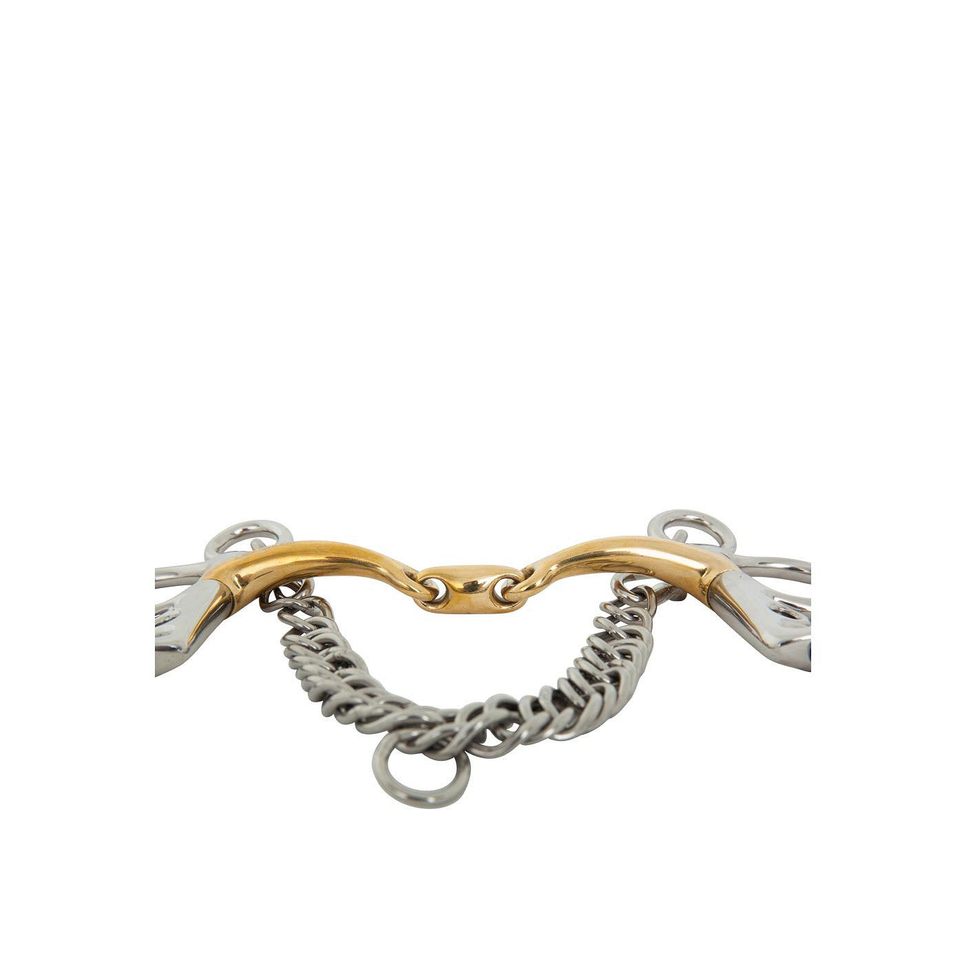 Ce mors Pelham "Baby" à double brisure de haute qualité, avec des branches lâches et un effet de levier, est fabriqué en Cuprigan massif avec des anneaux en acier inoxydable. Le Cuprigan est un alliage composé de 89% de cuivre, 7% d'aluminium, 3% de fer et 1% de zinc. Le processus d'oxydation du matériau dégage une odeur et un goût agréables. La forme anatomique suit la forme de la bouche du cheval, créant une pression douce et uniforme. La combinaison de la conception et de la composition unique du Cuprigan stimule la mastication et la production de salive, ce qui permet une connexion fine avec la bouche sensible du cheval. Les branches ascendantes avec anneau sont légèrement tournées vers l'extérieur, ce qui offre une liberté optimale pour la tête du cheval. Le mors a une action nette sur la bouche. L'embouchure a une épaisseur de 14 mm et les branches ont une longueur de 102 mm. Comprend une gourmette. ??