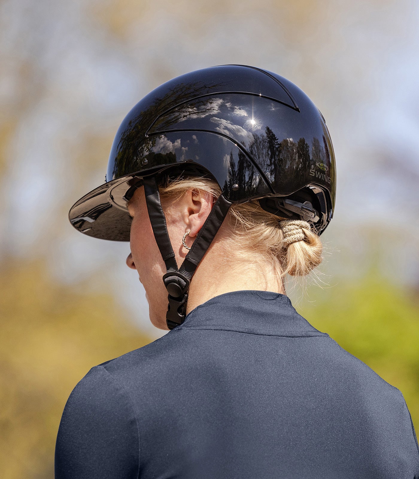 The sporty design combines aesthetics and elegance, while the integrated air vents guarantee optimum air circulation. The inner lining can be easily replaced and washed using press studs. The flexible visor and front grille with integrated safety net offer additional protection and stability. Whether jumping, dressage or cross-country riding – the SWING H24 is ideal for all riding disciplines.