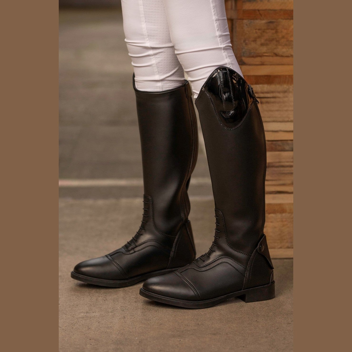 Synthetische leren rijlaars met ritssluiting aan de achterzijde. De rits is boven en onder afgedekt met een flapje met een drukknoopsluiting. Aan de voorkant een elastische veter, een elastische inzet op de kuit voor een optimale aansluiting en een lak versiering naast de knie.