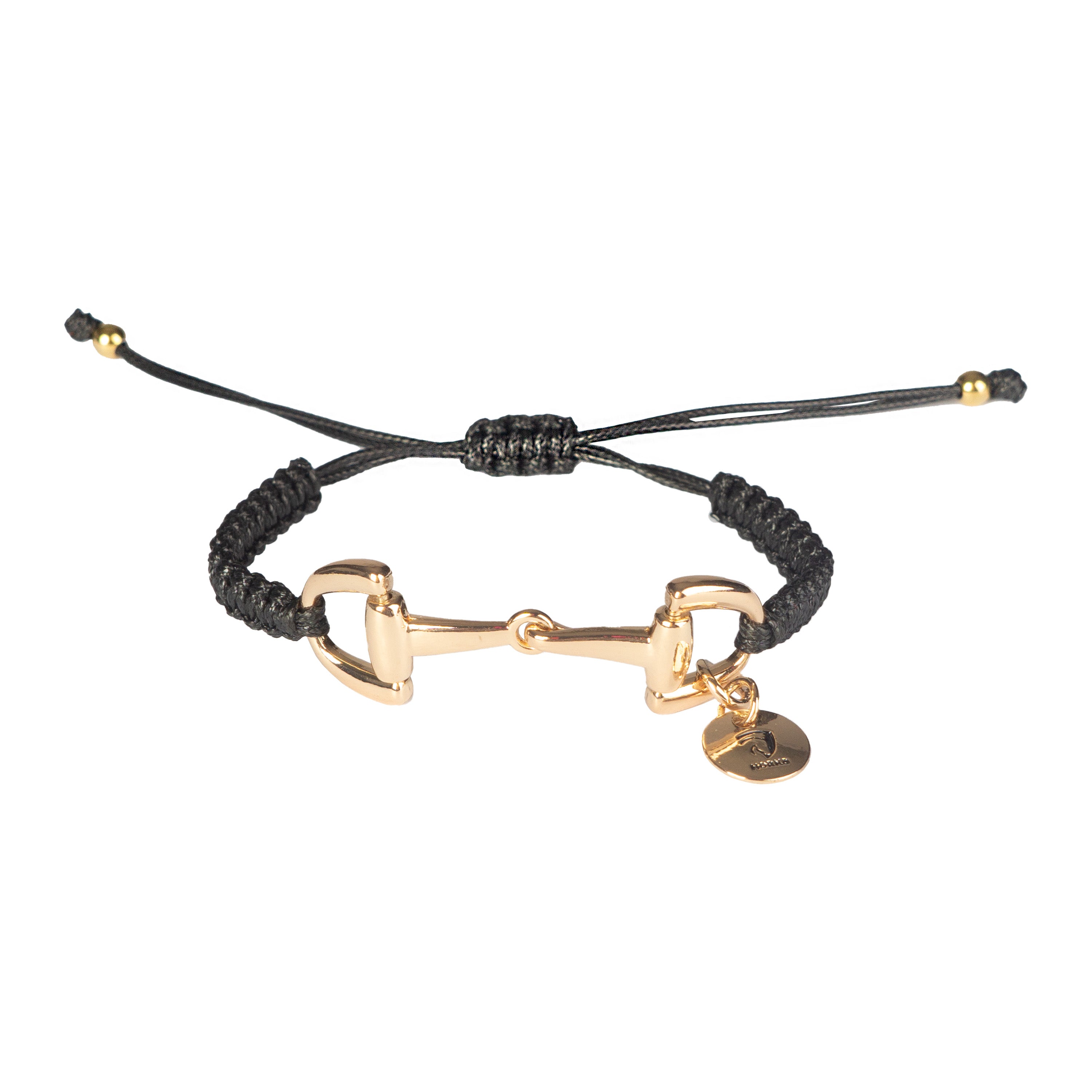 Gevlochten armband met metalen bitje. Ruim verstelbaar middels schuifknoop. Afmetingen: Kortste lengte: 16 cm Langste lengte: 24 cm Materiaal: Wax polyester garen en metaal