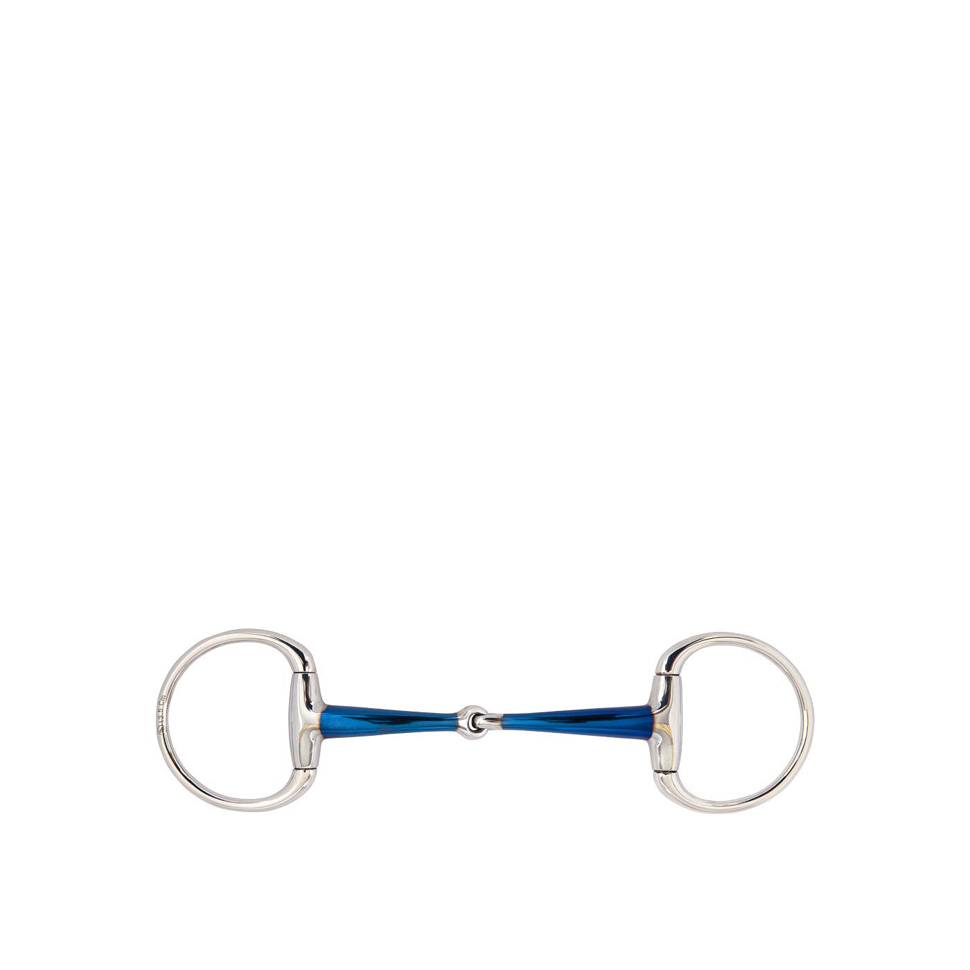 Deze enkel gebroken bustrens is vervaardigd van massief roestvrij stalen ringen en een zacht stalen mondstuk gecombineerd met een sweet iron laagje op het mondstuk (blauw). De sweet iron coating op het mondstuk stimuleert de aanmaak van speeksel. Wanneer dit materiaal reageert met vocht, warmte en lucht zal het oxideren en een zoet smakende oppervlakteroest ontwikkelen. Dit helpt bij de acceptatie van het bit. Uiteindelijk verdwijnt de blauwe kleur, maar de smaak van het oppervlakteroest blijft.