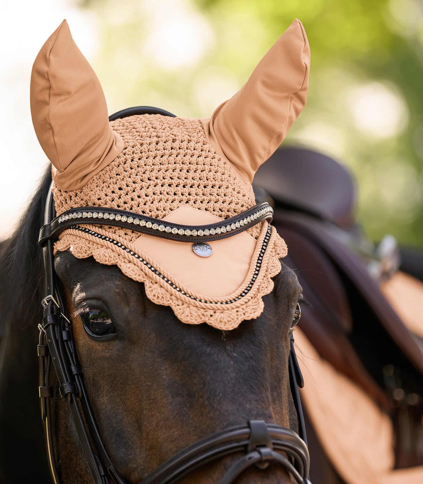 Hoogwaardig oornetje met elastische oren, perfect passend bij onze Turin-collectie. Een glinsterende strassband tussen twee bijpassende decoratieve koorden zorgt voor een elegante touch. De zilverkleurige metalen plaat is centraal geplaatst op een glanzende stoffen applicatie – voor een harmonieuze uitstraling als set. Het Turin oornetje biedt ook effectieve bescherming tegen hinderlijke insecten. Het elastische materiaal bij de oren zorgt voor een perfecte pasvorm op het hoofd van het paard.