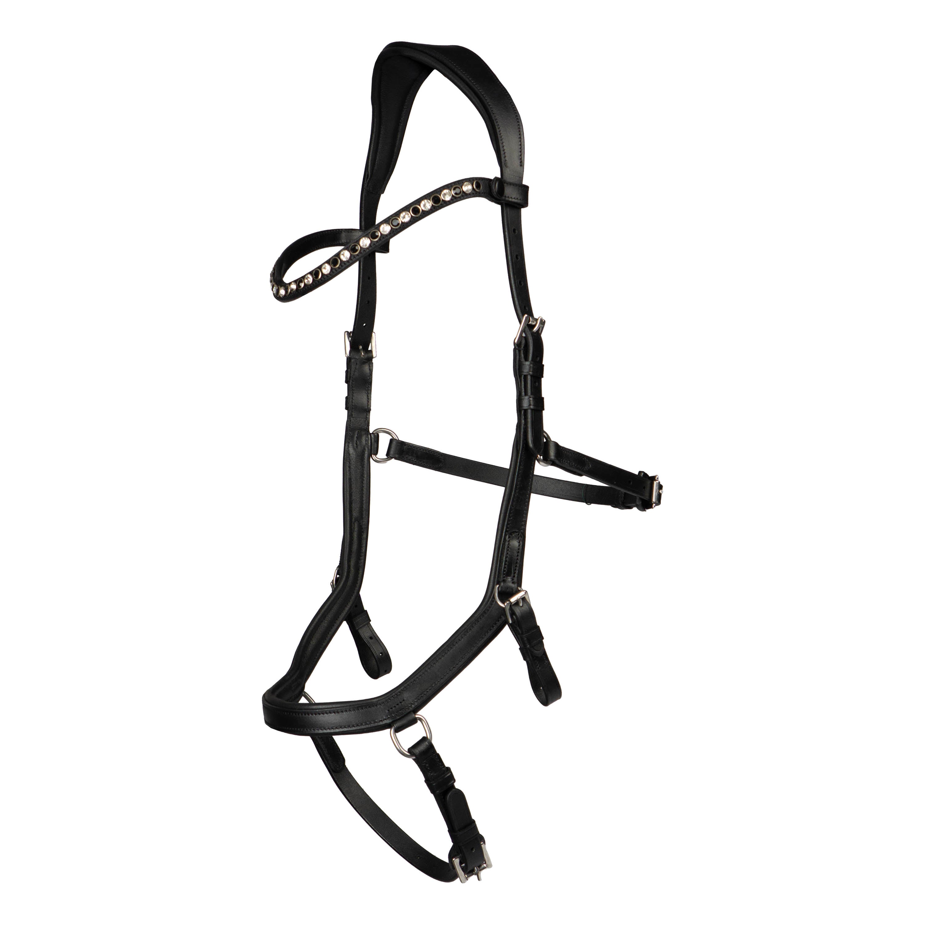 Hoofdstel Nox is anatomisch gevormd waardoor druk op gevoelige plekken wordt vermeden. Inclusief leren teugels en bitriempjes waarmee je het bit op de juiste hoogte kunt afstellen. De frontriem bevat zwarte en witte strass steentjes en is gemakkelijk afneembaar door middel van een drukknoop. Productspecificaties: < Inclusief leren teugels Inclusief bitriempjes twee maten Neusriem wit onderlegd Anatomisch gevormd Frontriem met zwarte en witte steentjes Gemakkelijk afneembare frontriem door middel van een drukknoop Materiaal:< 100% leer