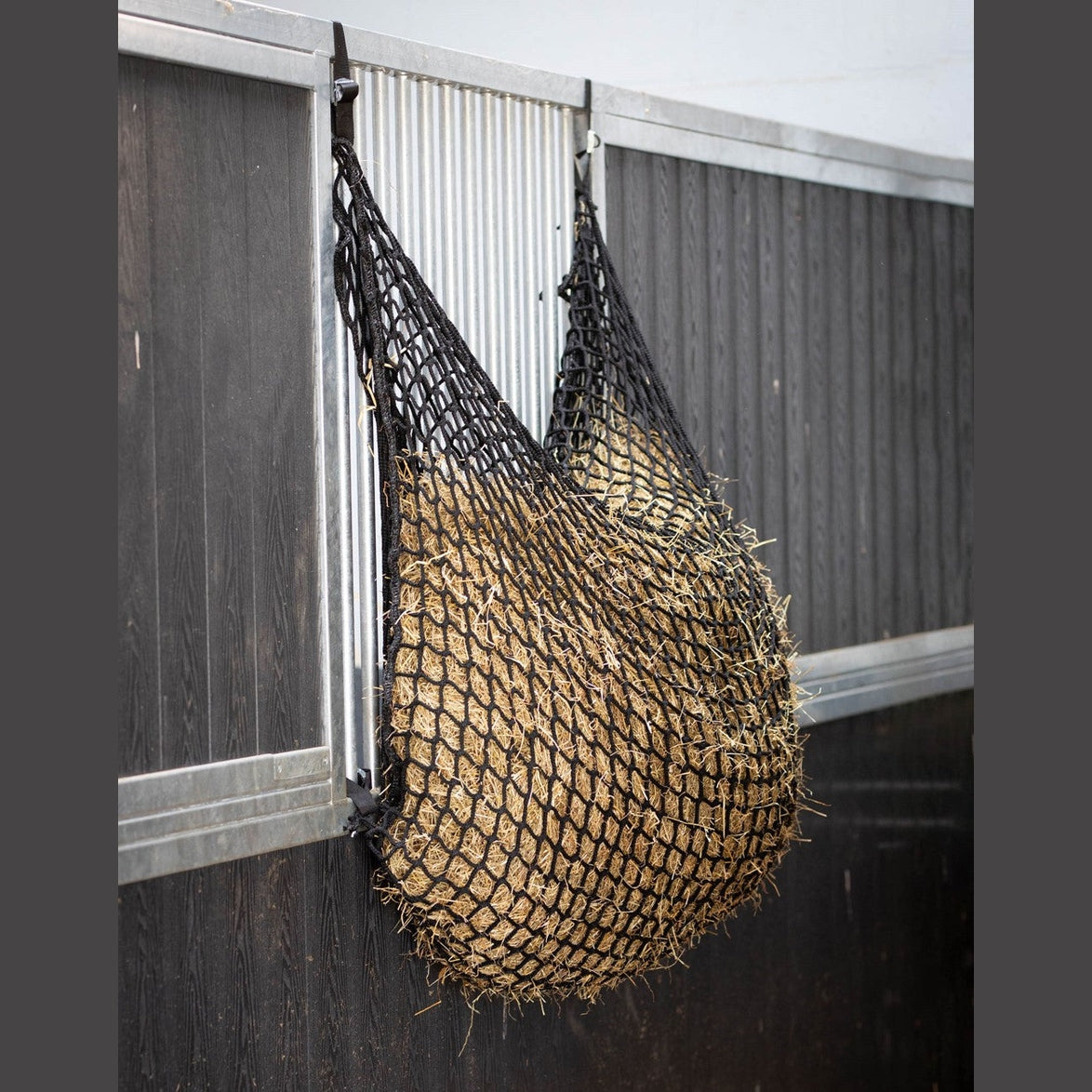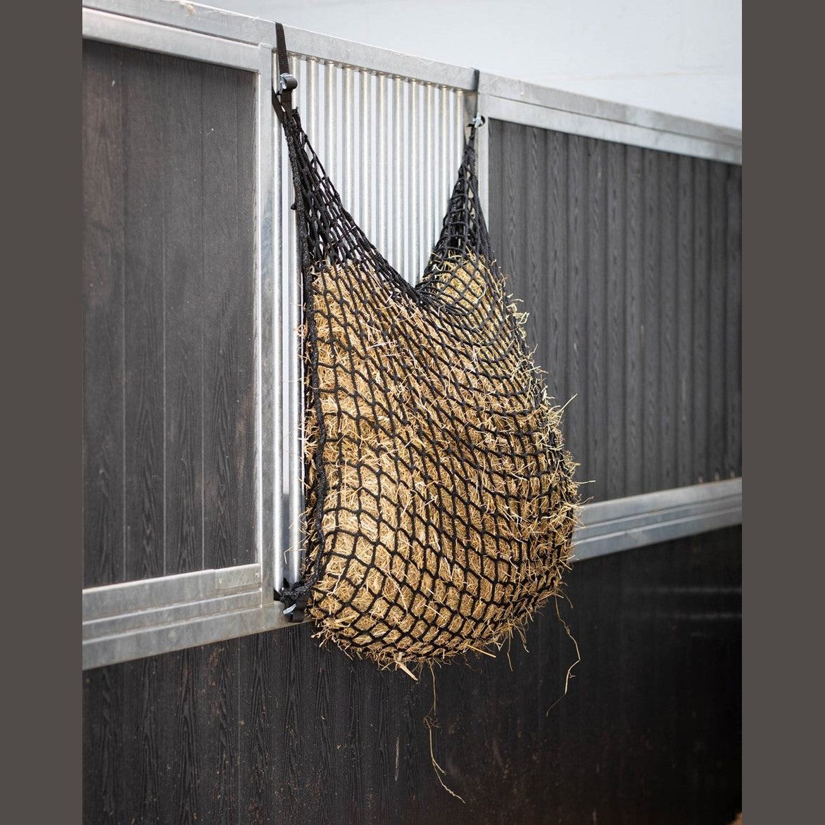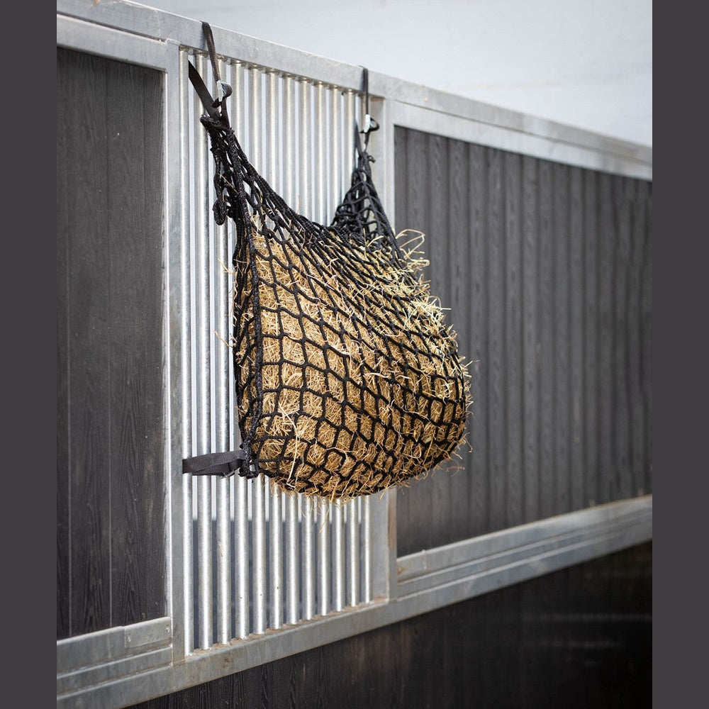 Dit sterke hooinet is een "slow feeder". Het materiaal is knooploos. Door het fijne maassysteem wordt de snelheid van de ruwvoeropname vertraagd en de fourage-tijd verlengd. Doordat het hooinet fijnmazig is bespaar dit tot 30% voer. Met 4 lussen inclusief ratelsluiting voor makkelijke bevestiging.
