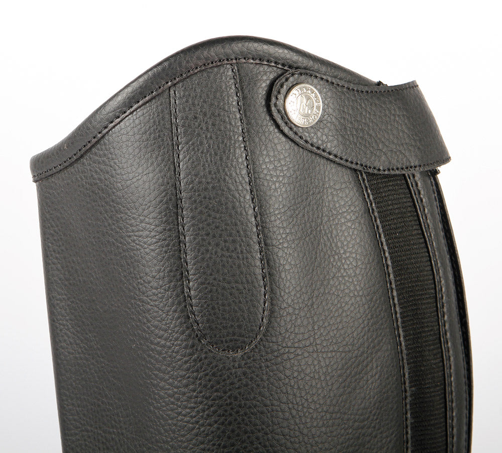 Minichap bestaande uit synthetisch leder en elastiek. Elegante pasvorm met dressuurboog.