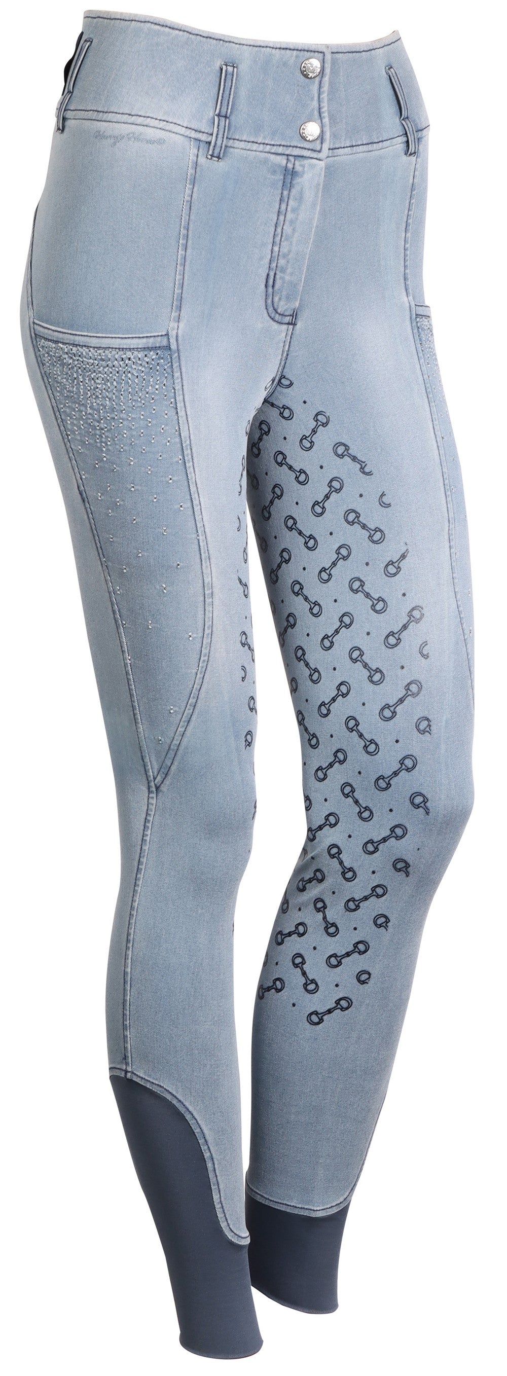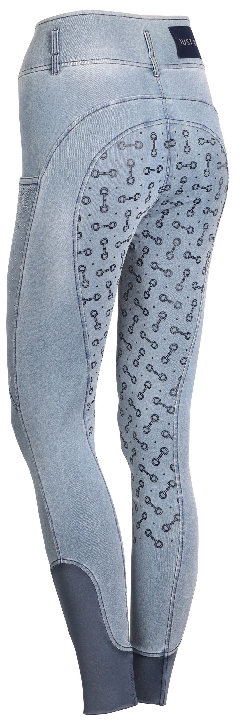 Paardrijlegging in een stretch denim materiaal met twee steekzakken met lasercut details, een brede tailleband met riemlussen en een Just Ride badge aan de achterkant, rondgenaaid zitvlak voorzien van een siliconen print voor extra grip in het zadel en een elastische inzet rond de enkels voor meer comfort in je paardrijlaarzen.