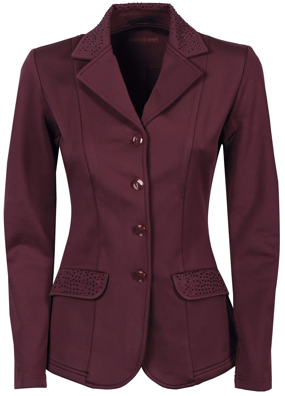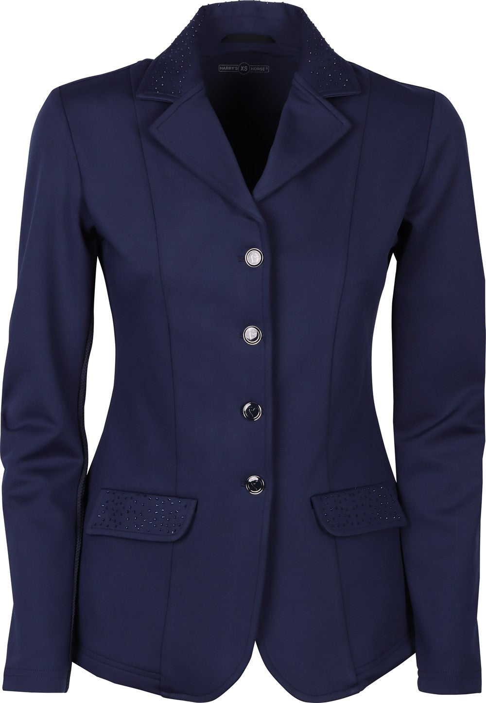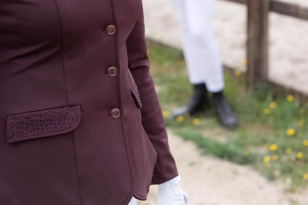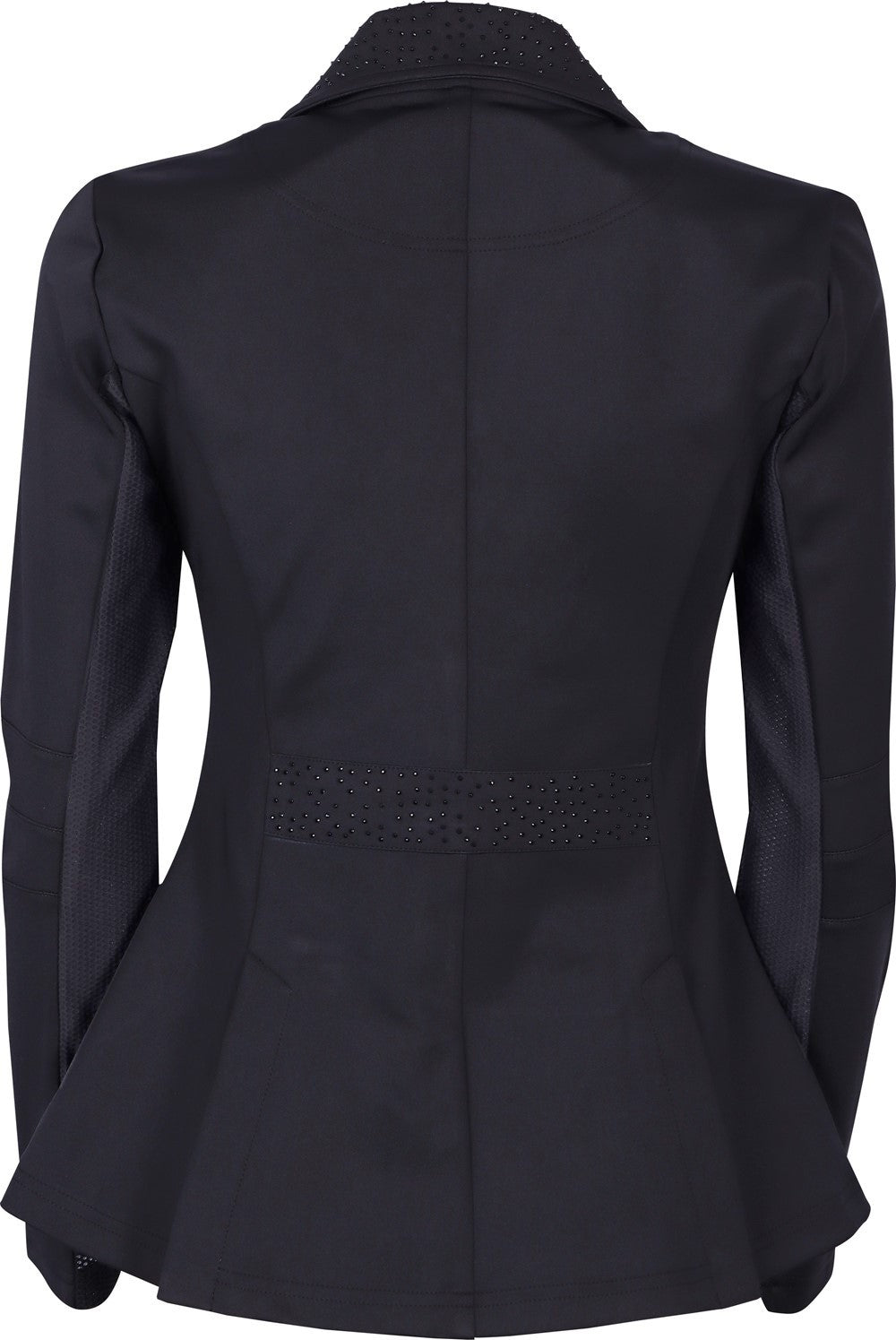 Wedstrijdjas van hoogwaardig stretch materiaal. Uitgevoerd met twee steekzakken en een ritssluiting achter de knopenlijst. Kristallen op de kraag en zakken. Mesh inzet onderkant mouw.
