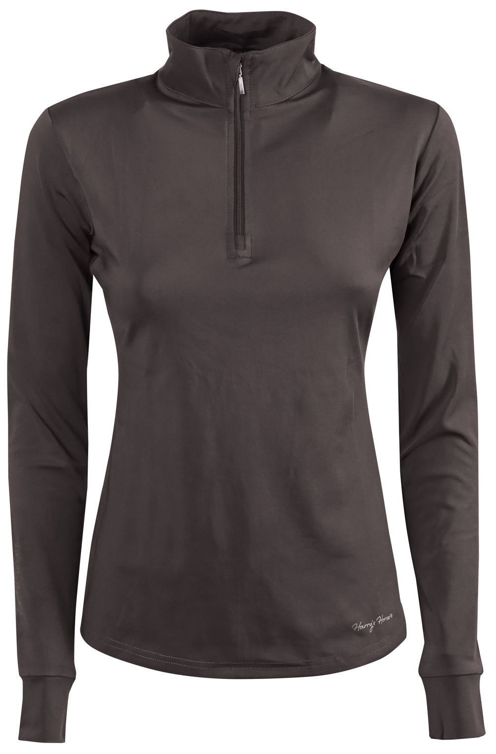 Shirt met lange mouw, opstaande kraag met korte ritssluiting en het Equestrian Society logo op de kraag en op de linkermouw.