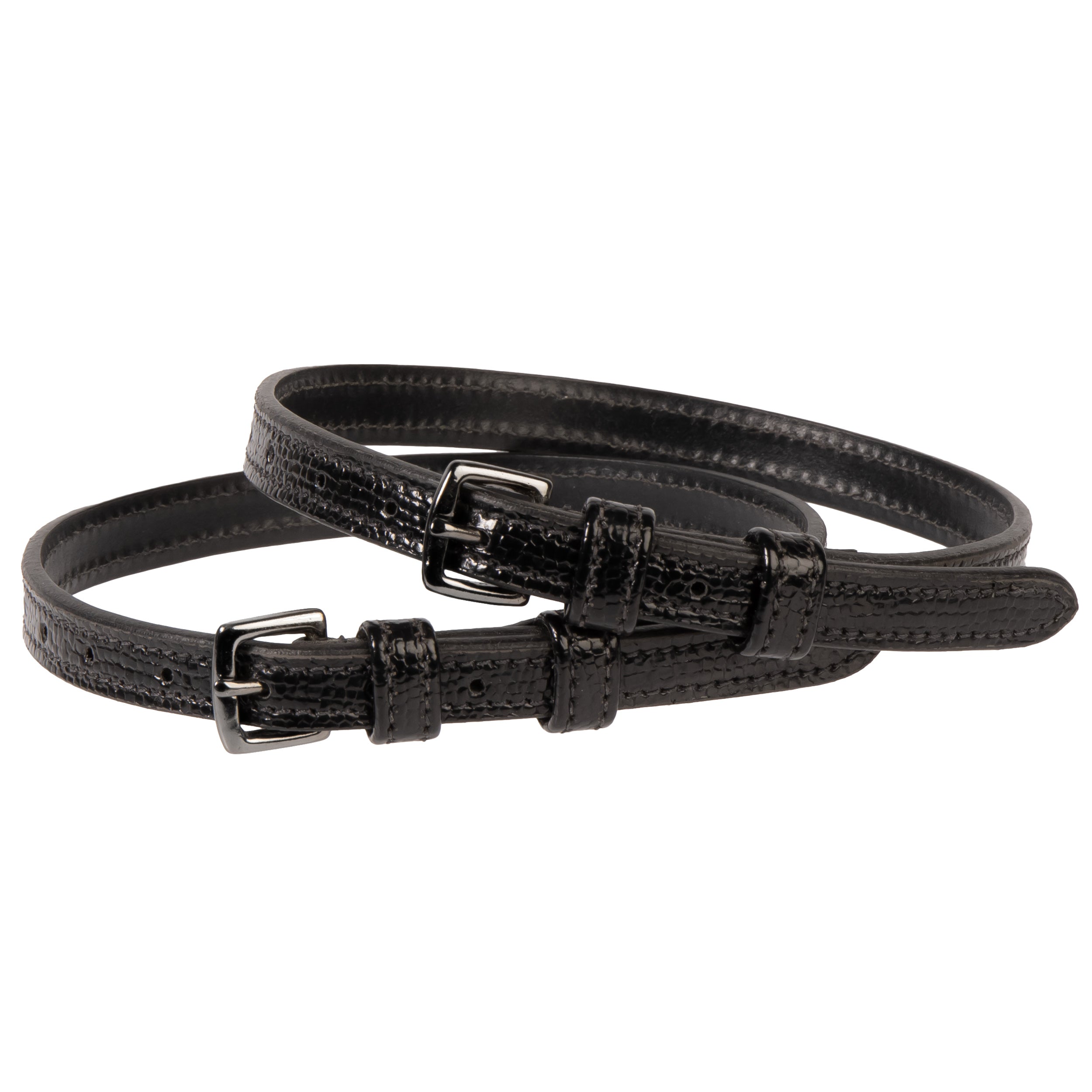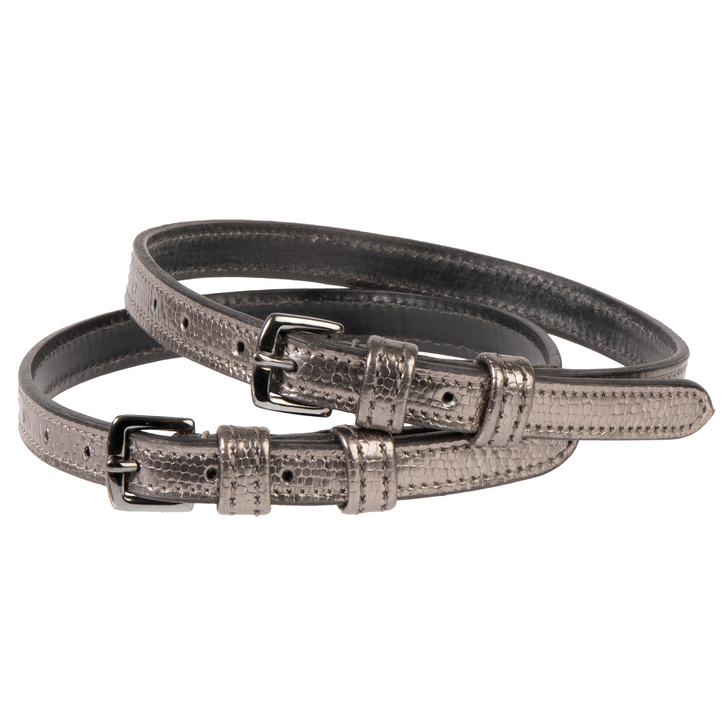 Sporenriempjes van leer met een stijlvol printeffect. Afgewerkt met gunmetal kleurige gespen.