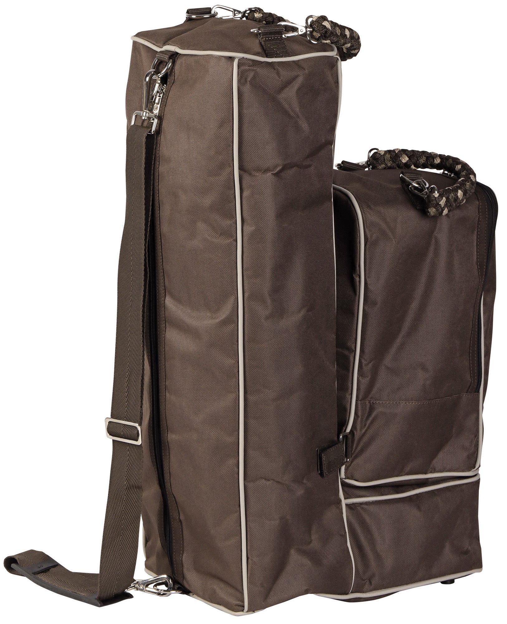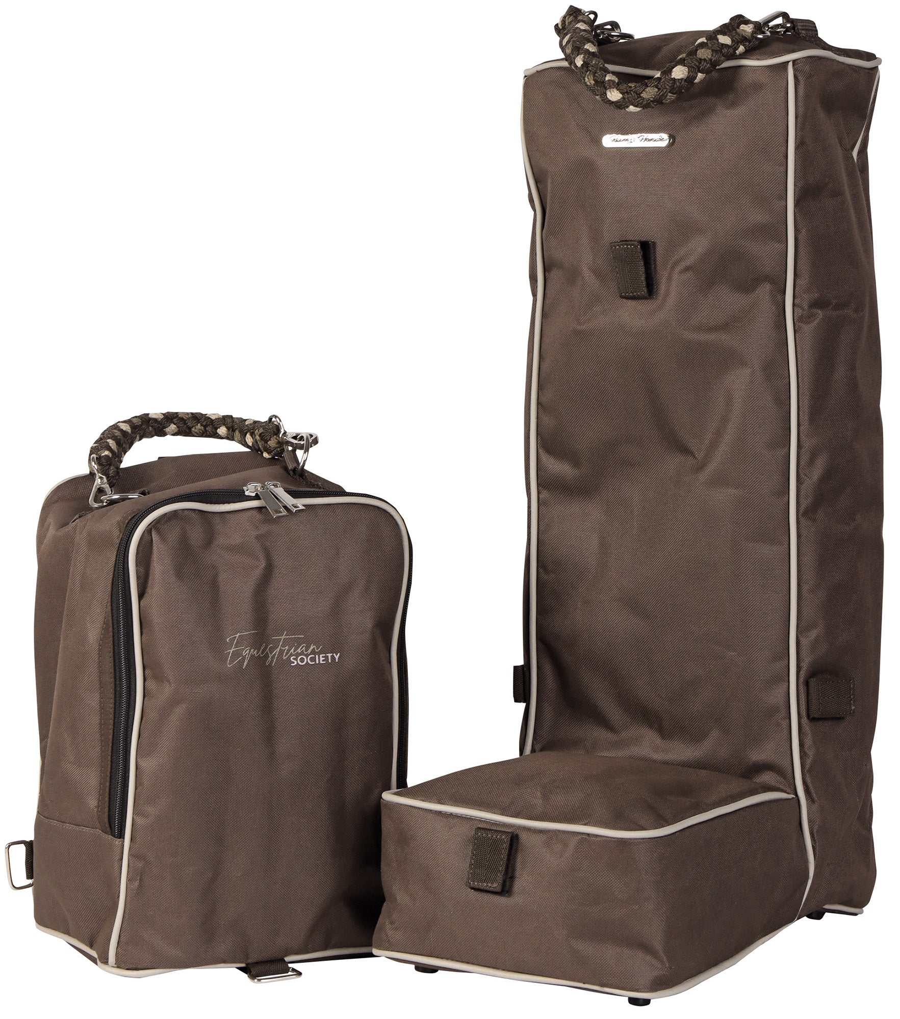 Praktische en stijlvolle laarzentas met ritssluiting aan de achterzijde. Aan de voorkant bevindt zich een afneembare (cap)tas met klittenbandsluiting, ideaal voor je cap, verzorgingsartikelen of persoonlijke spullen. Gemaakt van stevig 600D polyester en afgewerkt met speelse kunstleder-paspels en een gevlochten handvat in vrolijke kleuren. Op het voorvak is het Equestrian Society logo geprint voor een herkenbare uitstraling.