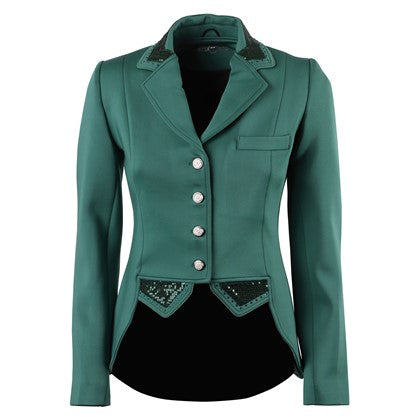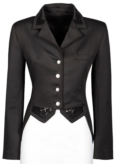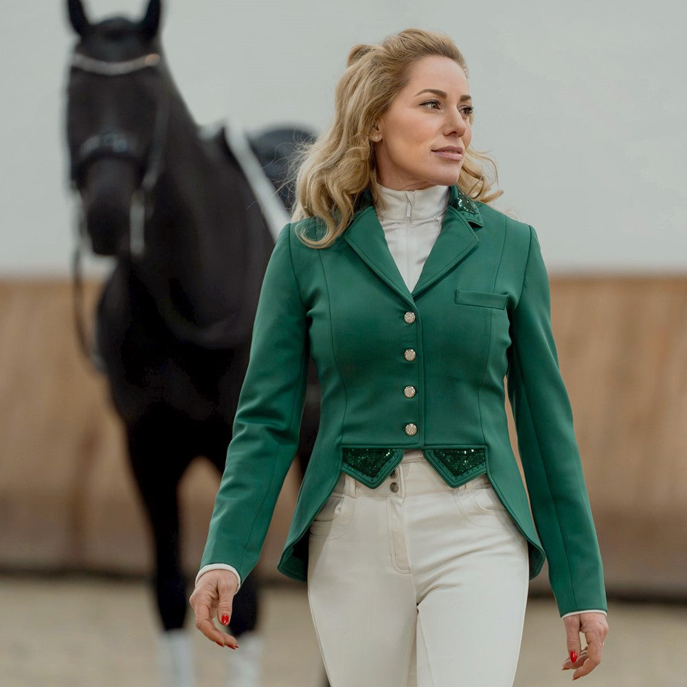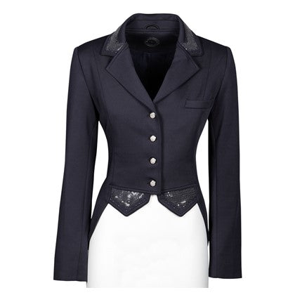 Veste de concours luxueuse en matière extensible de haute qualité. Elle est dotée d'une fermeture à boutons en cristal et d'une fermeture éclair en dessous pour un ajustement parfait. Le col et les rabats du gilet sont ornés de paillettes/cristaux et de passepoils ton sur ton. Boutons décoratifs.