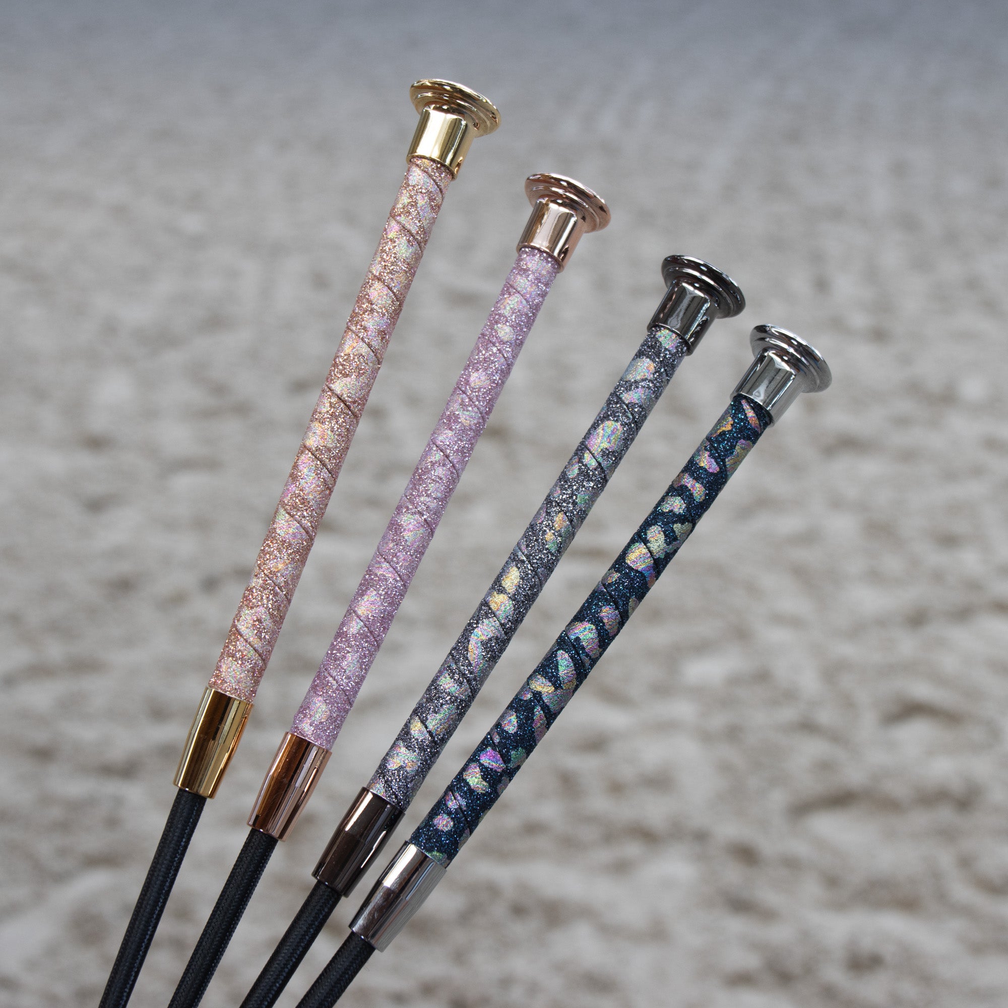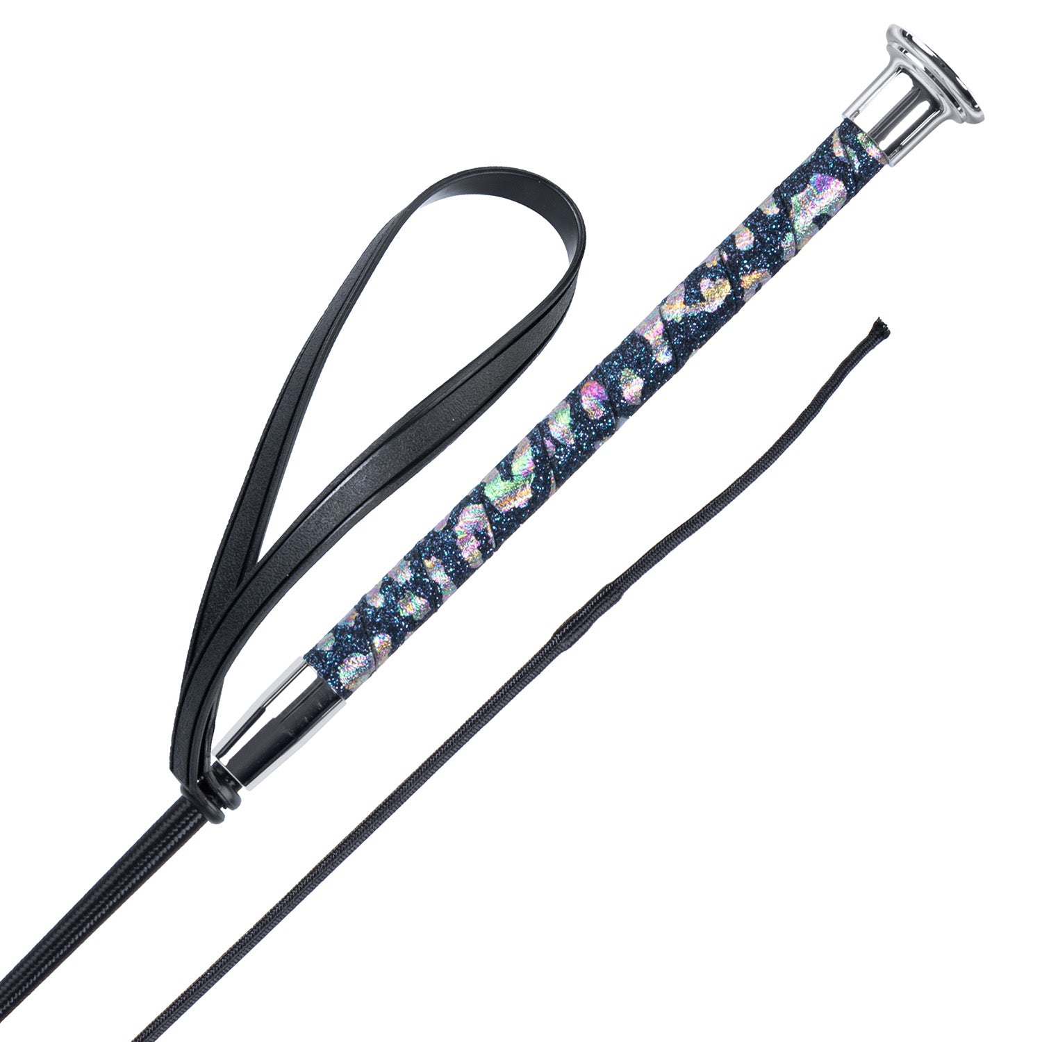 Cravache avec poignée panthère à paillettes colorées et dragonne.