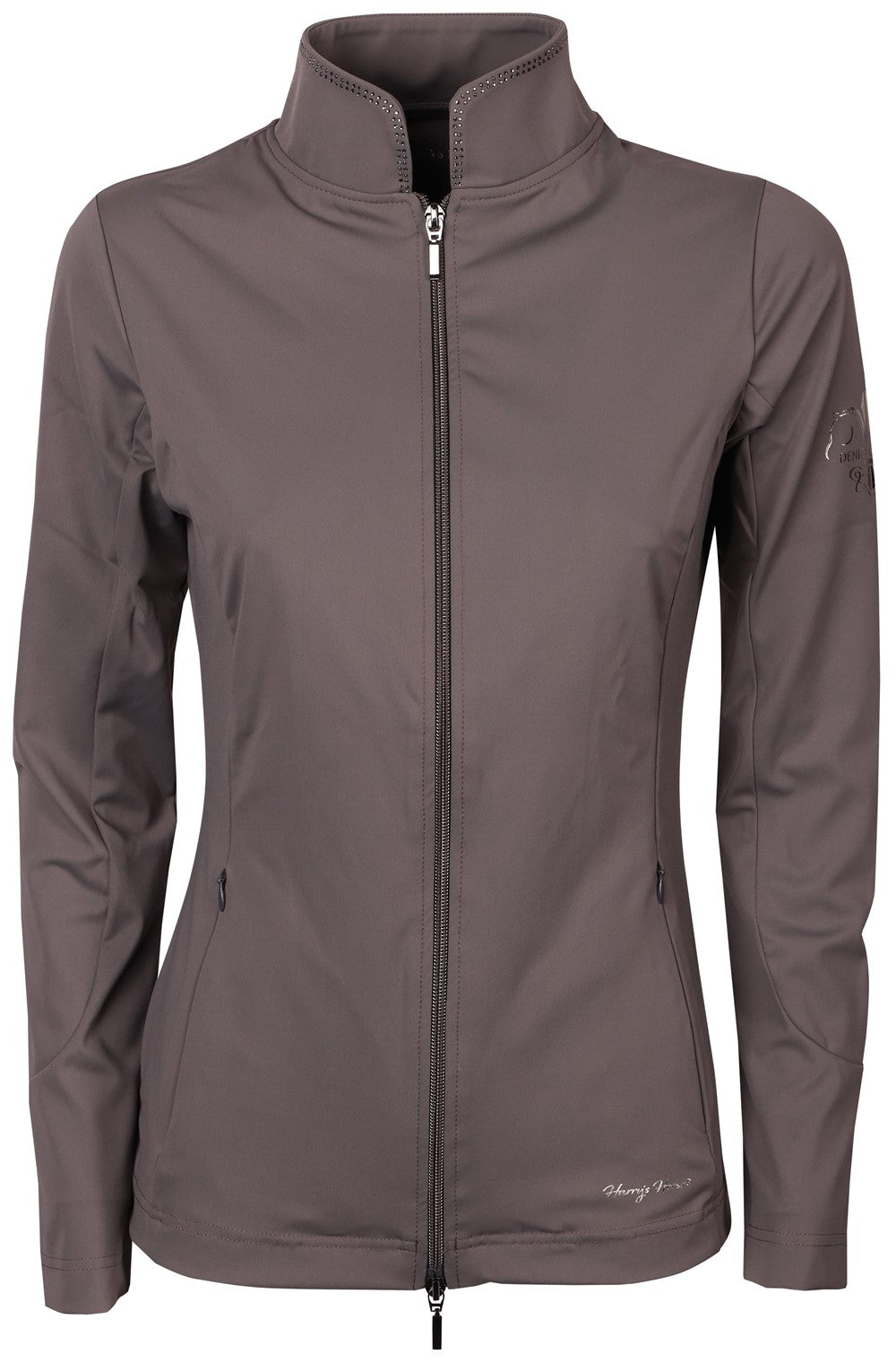 Cardigan avec col montant orné d'une double rangée de cristaux, fermeture zippée à double sens, deux poches latérales zippées et logo Denici Cavalli sur la manche gauche.